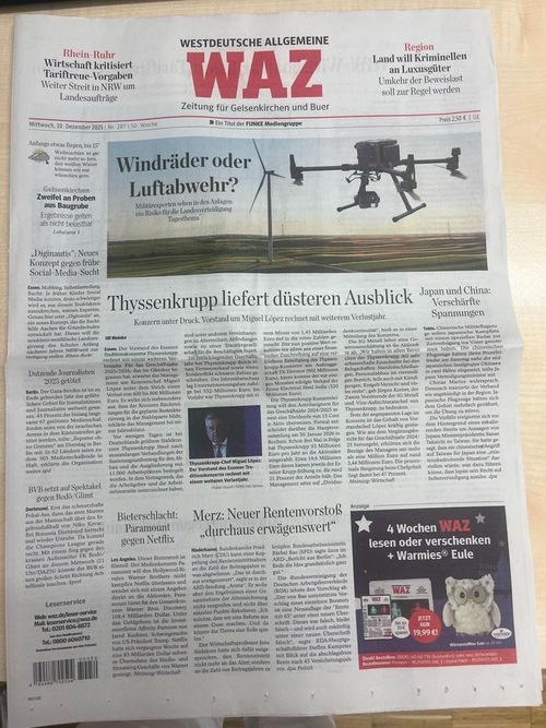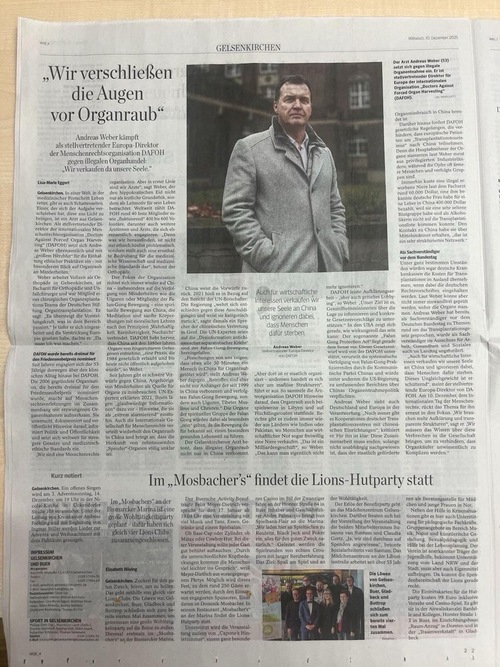 (Minghui.org) 10 декабря 2025 года, в День прав человека, местное издание газеты Westdeutsche Allgemeine Zeitung в Гельзенкирхене опубликовало статью под названием «Мы закрываем глаза на извлечение органов». В ней содержится призыв к жителям Германии обратить внимание на санкционированное компартией Китая насильственное извлечение органов.