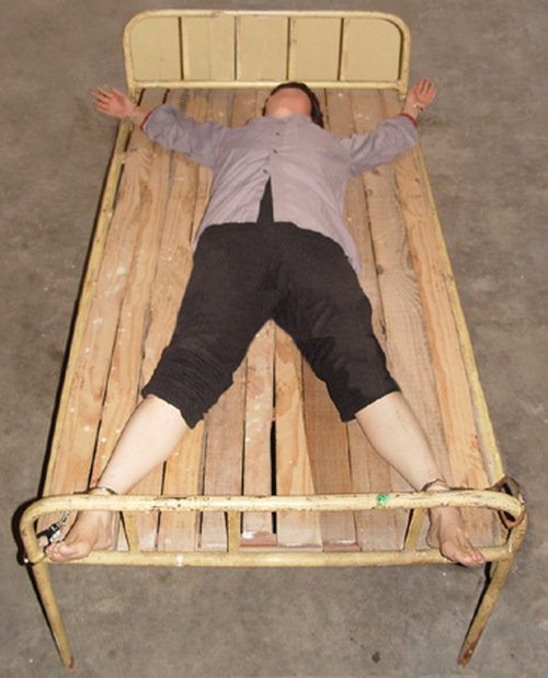 После того как его доставили в Управление внутренней безопасности города Яньцзи, полицейские заковали его в наручники и кандалы. Чтобы заставить отвечать на вопросы, его согнули и обмотав верёвку вокруг шеи, привязали к ногам так, что расстояние от ног до шеи составляло всего около 15 сантиметров.