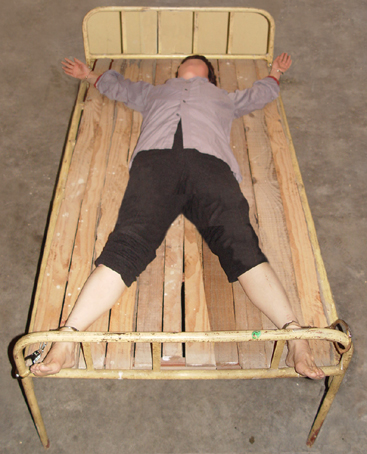 Чтобы заставить его отказаться от Фалуньгун, охранники зафиксировали его ноги в позе двойного лотоса и связали руки за спиной. Ему запретили пользоваться туалетом и угрожали держать связанным до тех пор, пока он не откажется от Фалуньгун. Несмотря на то, что его заставили написать заявление об отказе, он вскоре объявил его недействительным, поскольку оно было написано против его воли. Охранники связывали его ещё два раза, причём, самое длительное удержание продолжалось более 40 часов.