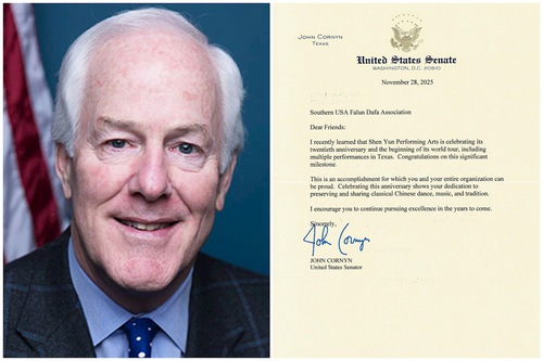 (Minghui.org) Сенатор США от штата Техас Джон Корнин 28 ноября 2025 года направил письмо Ассоциации Фалунь Дафа южной части США, в котором поздравил компанию исполнительского искусства Shen Yun Performing Arts с 20-летием со дня основания и поблагодарил художественный коллектив за преданность делу и высокий уровень мастерства.
