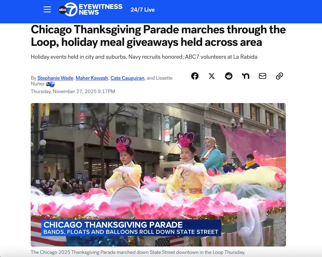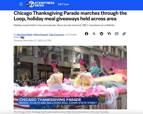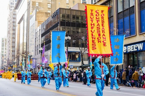 (Minghui.org) 91-й парад в честь Дня благодарения в Чикаго состоялся 27 ноября 2025 года. Было холодно, но зрители выстроились вдоль улиц, чтобы посмотреть праздничное шествие.