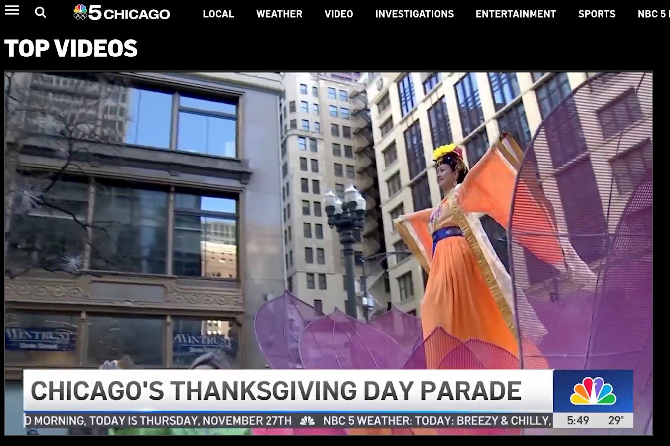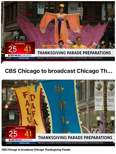 CBS Chicago в своём 34-секундном трейлере показывает красочное выступление практикующих Фалунь Дафа на параде 2024 года (составлено на основе скриншотов)