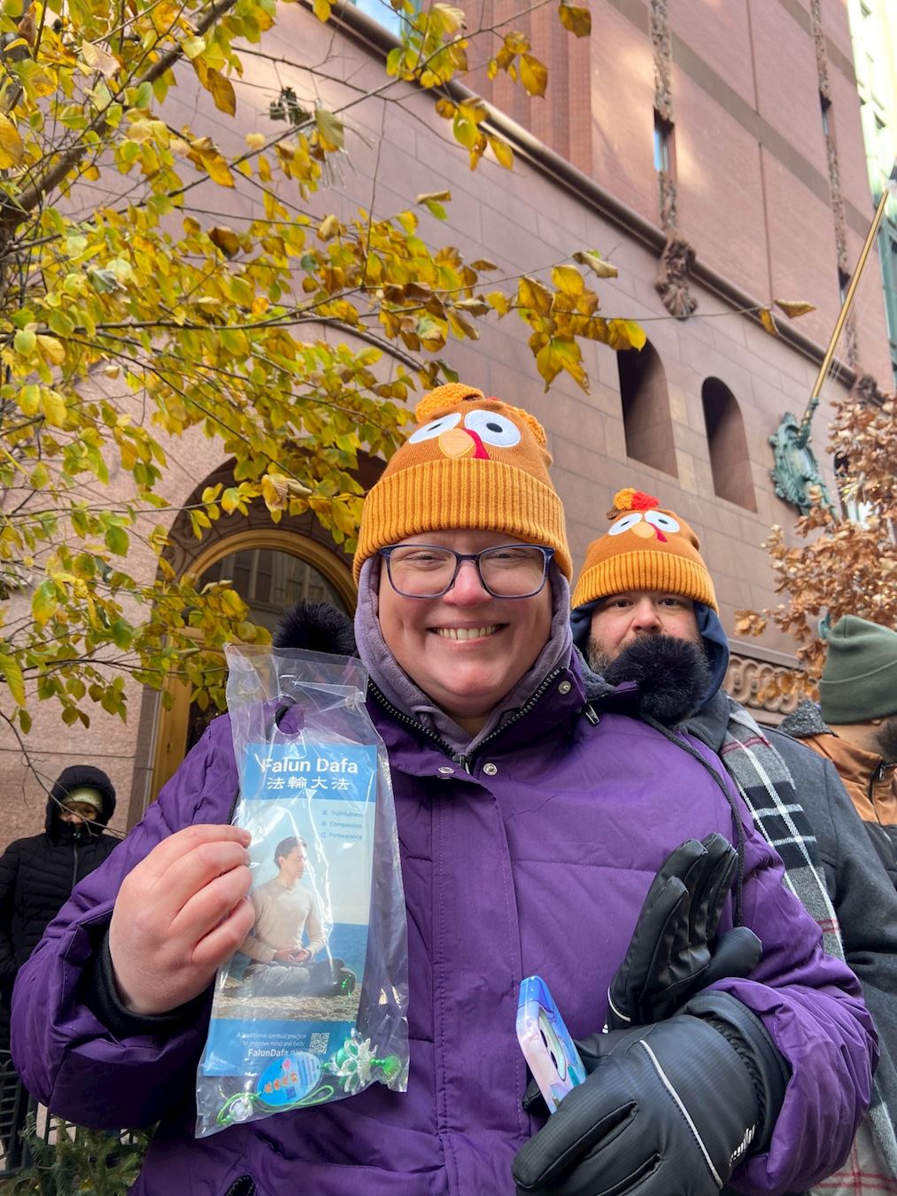 Чжан сказала, что День благодарения – это праздник, который заставляет её задуматься и ещё больше ценить Фалунь Дафа, так как её родители и дети получили пользу от практики Дафа. «Я искренне благодарна за то, что совершенствуюсь по Фалунь Дафа, – сказала Чжан, – и надеюсь, что люди, увидев наше выступление на параде, смогут почувствовать позитивную энергию и тепло Фалунь Дафа в холодный праздничный день».