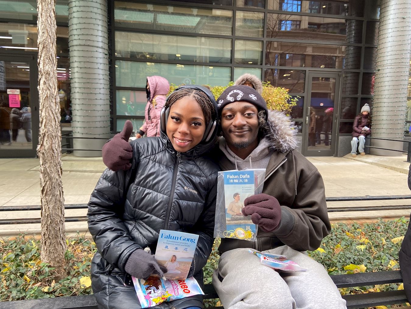 Ванесса (слева) и Тайран наслаждались выступлением практикующих на платформе Фалунь Дафа