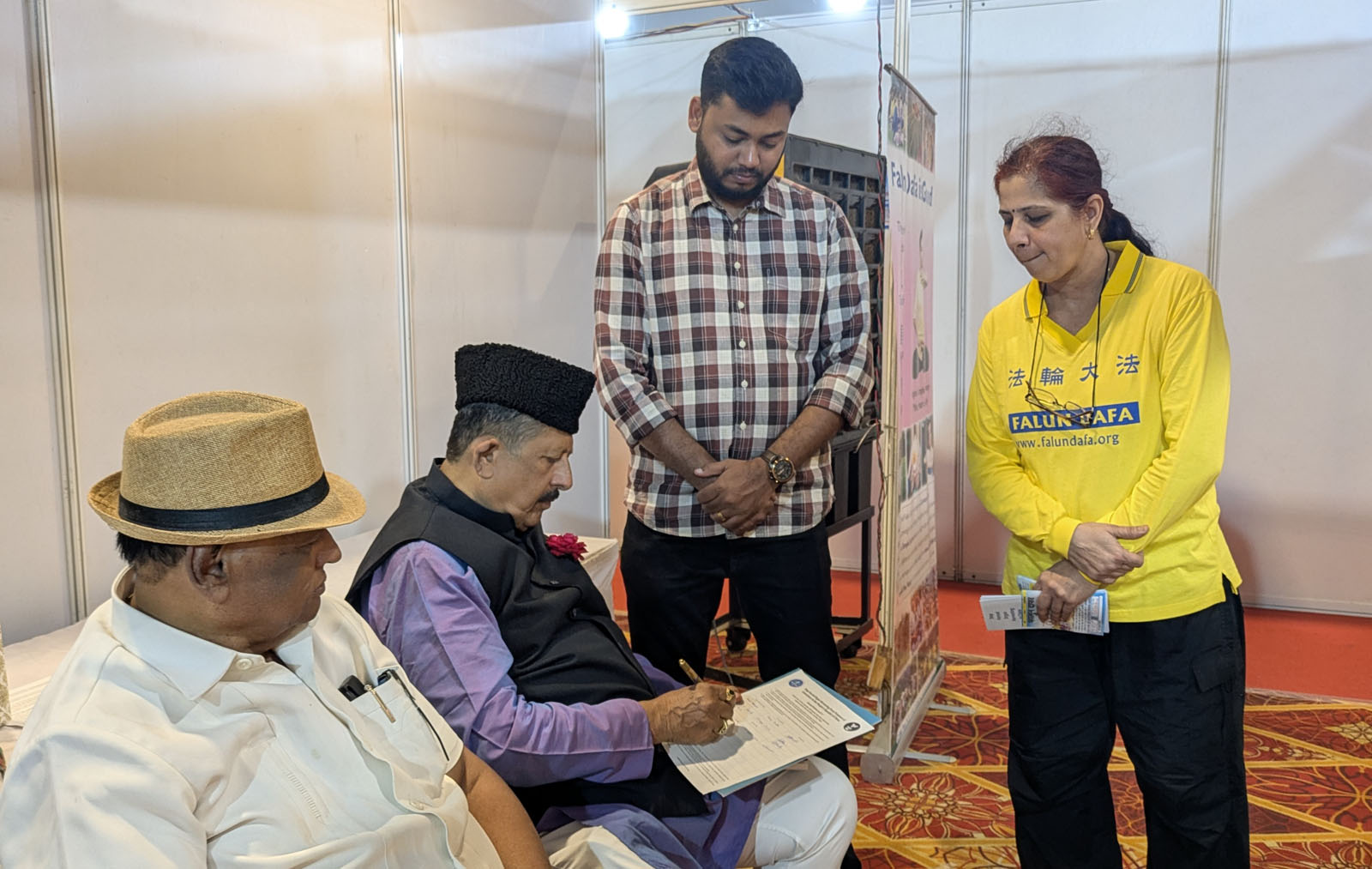 Во время открытия книжной ярмарки практикующие смогли познакомить с Фалунь Дафа почётного гостя выставки Вишваса Патила, известного писателя на языке маратхи и бывшего сотрудника административной службы Индии (IAS). Практикующие кратко рассказали ему о Фалунь Дафа и предоставили печатные материалы.