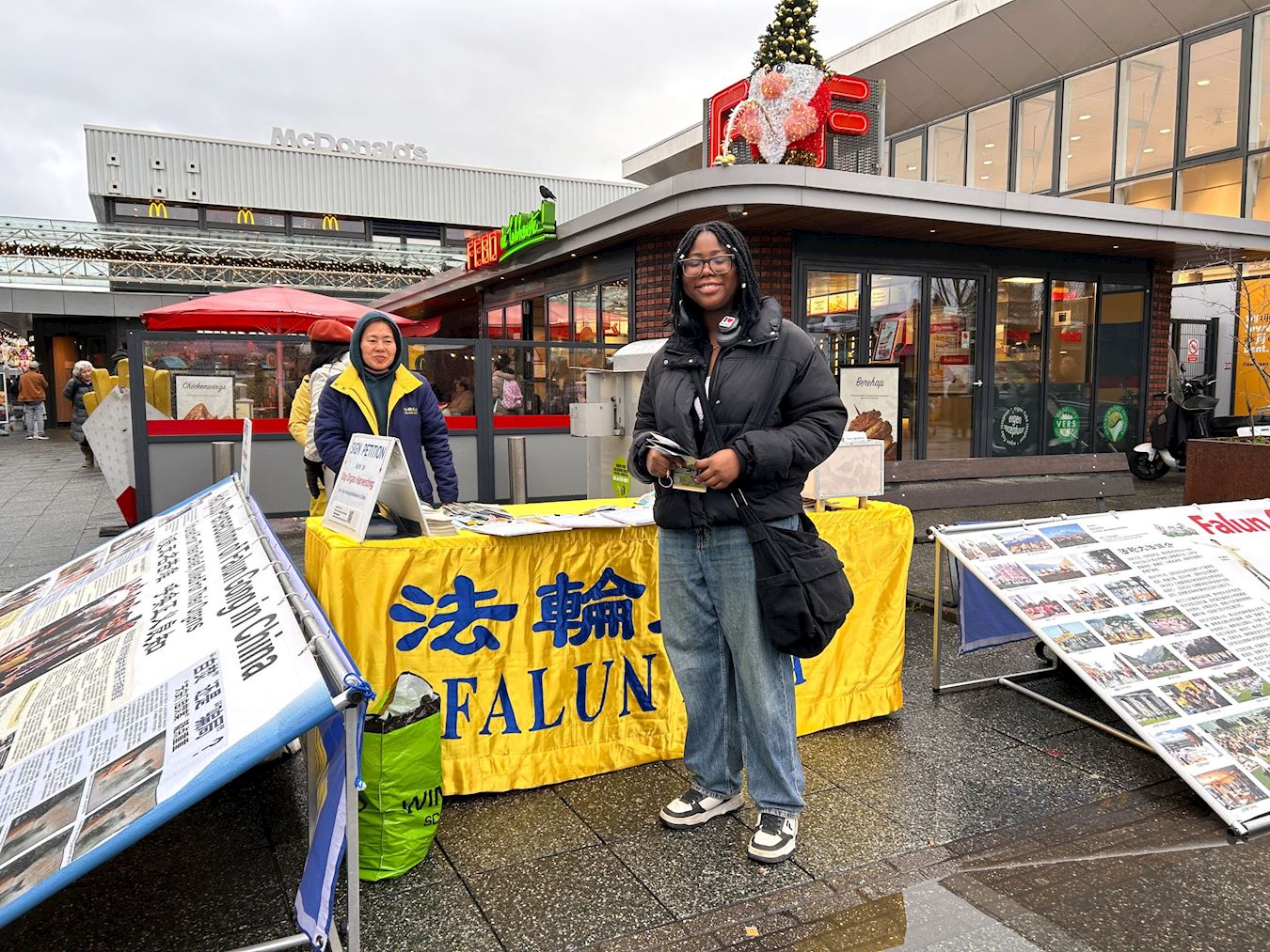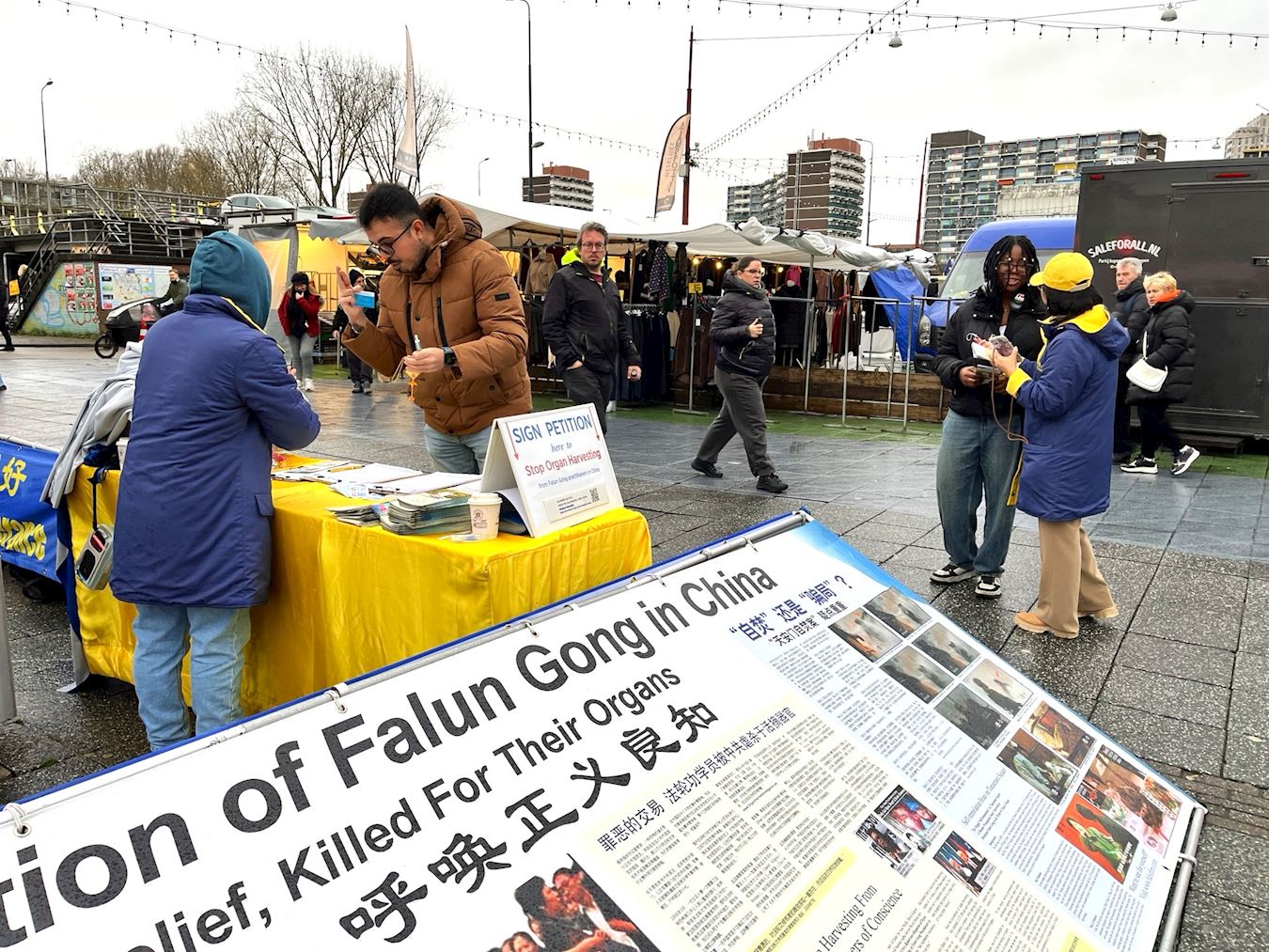 Практикующие Фалуньгун (Фалунь Дафа) установили рекламные щиты на площади Буйкслотермеер, демонстрировали упражнения, беседовали с людьми и раздавали буклеты. Они представляли Фалуньгун и информировали общественность о 26-летнем преследовании компартией Китая (КПК). Несмотря на то, что во время мероприятия шёл дождь, многие прохожие останавливались, чтобы узнать больше информации.