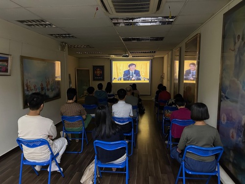 Участники девятидневного курса Фалунь Дафа, проходившего с 6 по 14 декабря 2025 года, просматривают видеозаписи лекций Учителя Ли
