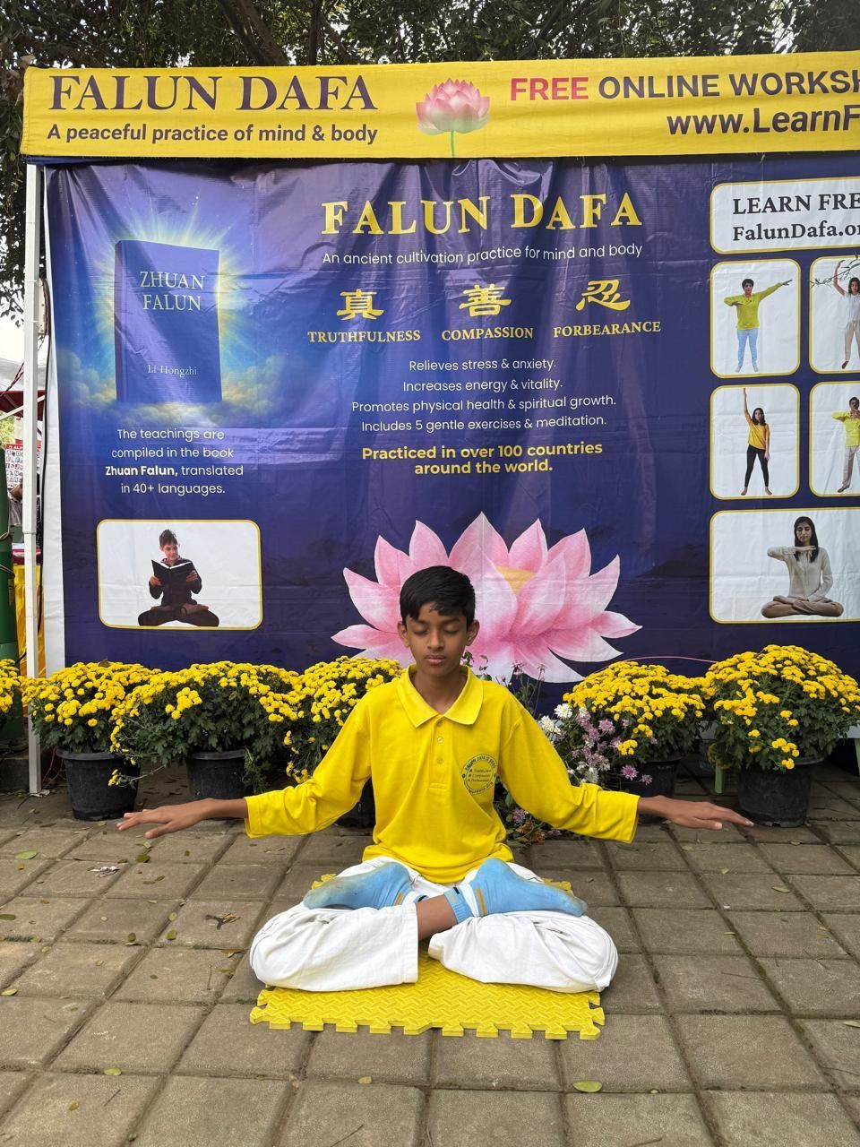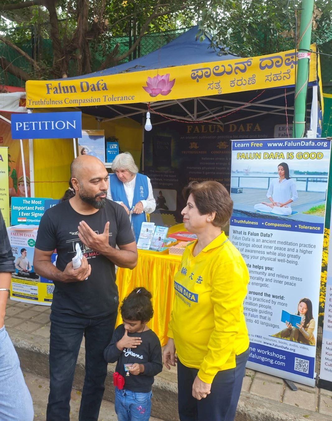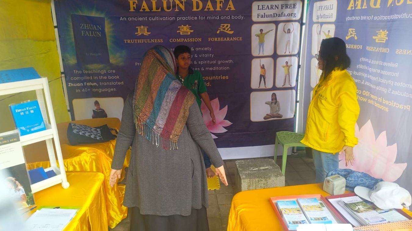 Рядом с палаткой практикующие демонстрировали упражнения растущему числу любопытных зрителей. Многие с энтузиазмом присоединялись к изучению практики, вдохновлённые гостеприимной и доброжелательной атмосферой, созданной волонтёрами. Посетитель Имран выразил своё восхищение: «Вы делаете замечательную работу, используя личное время». Его особенно впечатлила искренность практикующих, их готовность рассказать о пользе Дафа и о преследовании, которому подвергаются последователи этой системы самосовершенствования в Китае.