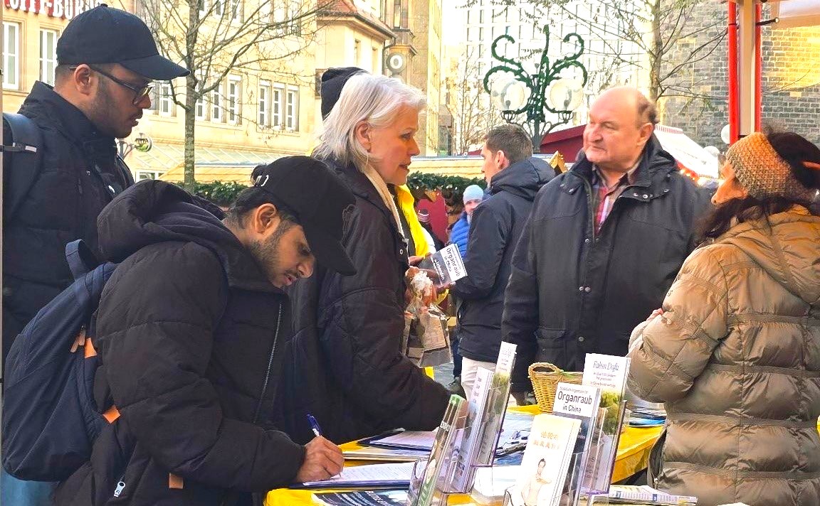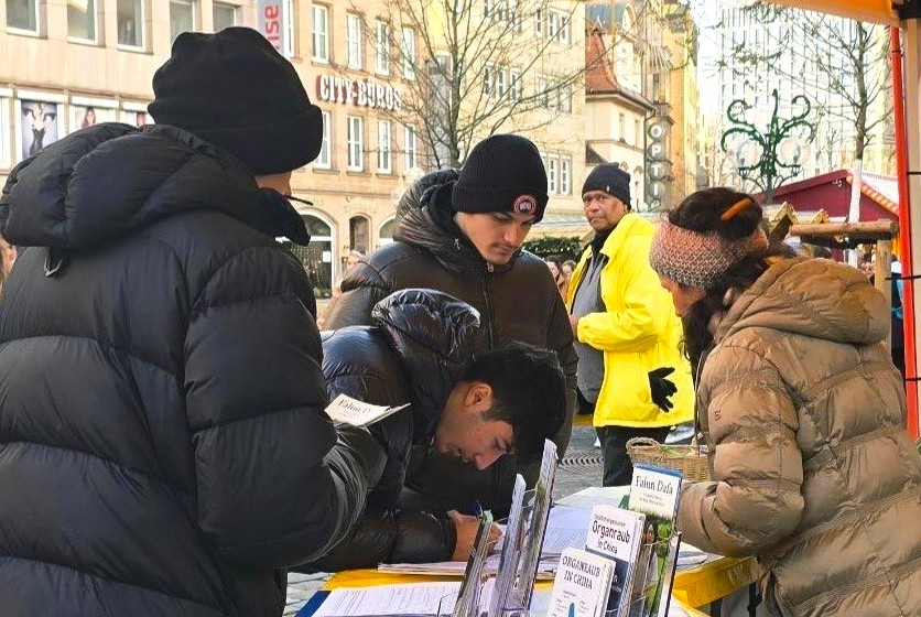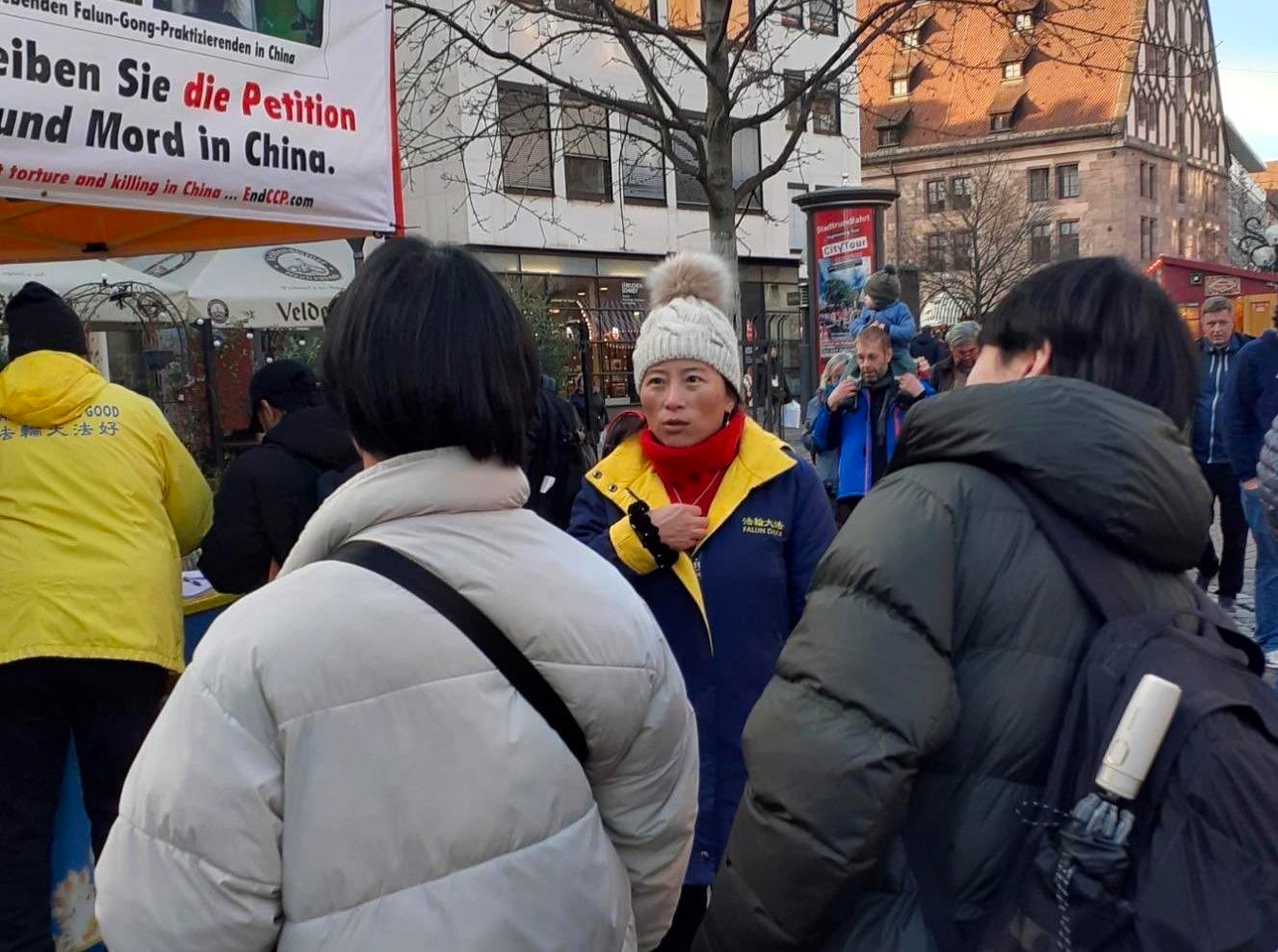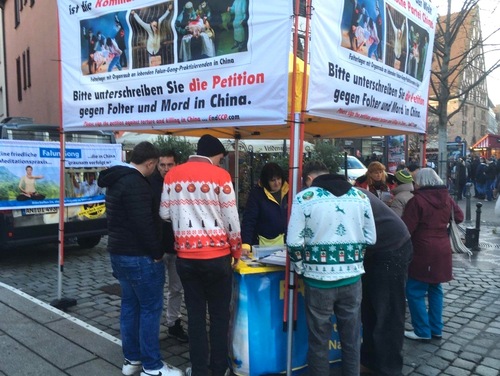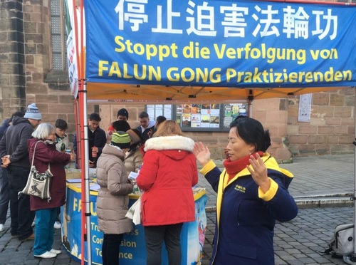 Это были последние выходные перед Рождеством, поэтому на знаменитой Нюрнбергской рождественской ярмарке было много туристов. Люди подписывали петицию с призывом положить конец преследованию Фалуньгун компартией Китая и призывали практикующих не сдаваться и продолжать разоблачать преступления КПК.