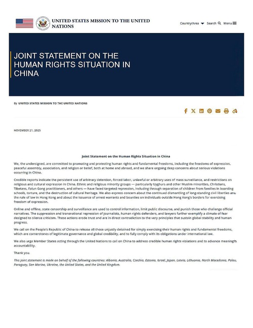 (Minghui.org) 15 государств, являющихся членами Организации Объединённых Наций, 21 ноября 2025 года опубликовали совместное заявление под названием «Совместное заявление о ситуации с правами человека в Китае». Заявление также доступно на веб-сайте Представительства США при Организации Объединенных Наций.