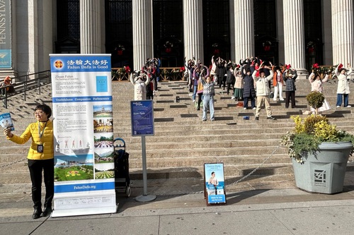 Пенсильванский вокзал, расположенный в самом сердце Манхэттена, является крупнейшим транспортным узлом США, через который каждый день проходит около 600 000 пассажиров. Он находится напротив Мэдисон-сквер-Гарден, ещё одной достопримечательности Нью-Йорка. Это место также служит площадкой для коллективных занятий, где практикующие, работающие в Манхэттене, выполняют упражнения Фалунь Дафа во время обеденного перерыва.