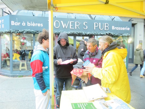 29 ноября, несмотря на дождливую погоду, многие люди останавливались, чтобы поговорить с практикующими на площади Альфонса Фике, и подписывали петицию, призывающую остановить преследование практикующих Фалунь Дафа компартией Китая.