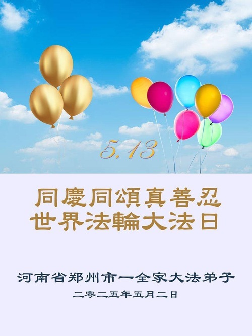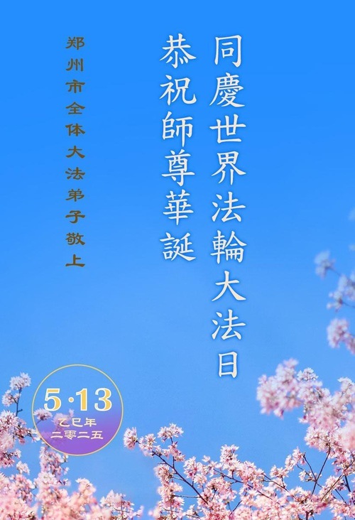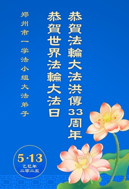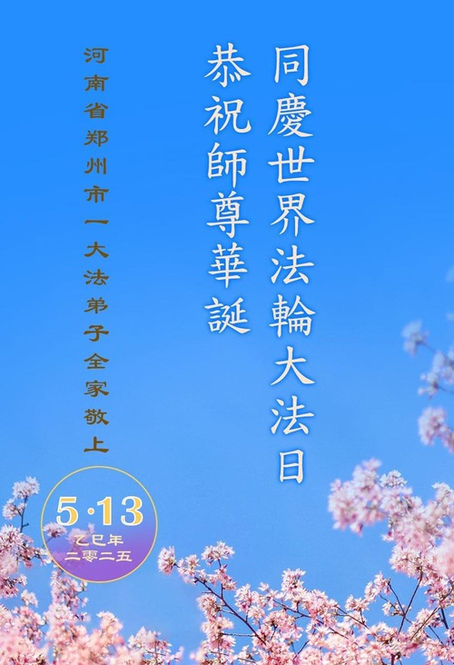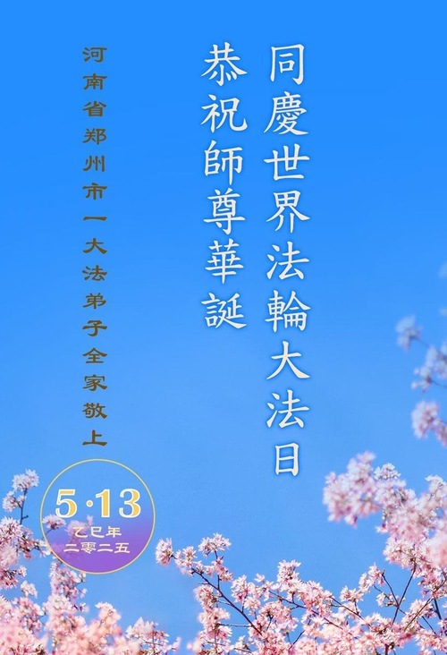 (Minghui.org) 13 мая 2025 года отмечается 26-й Всемирный День Фалунь Дафа и 33-я годовщина публичного представления Фалунь Дафа. Этот день также является Днём рождения Мастера Ли, основателя Фалунь Дафа. Практикующие по всему миру шлют свои сердечные поздравления, чтобы отпраздновать это важное событие и поблагодарить уважаемого Учителя в этот особенный день.