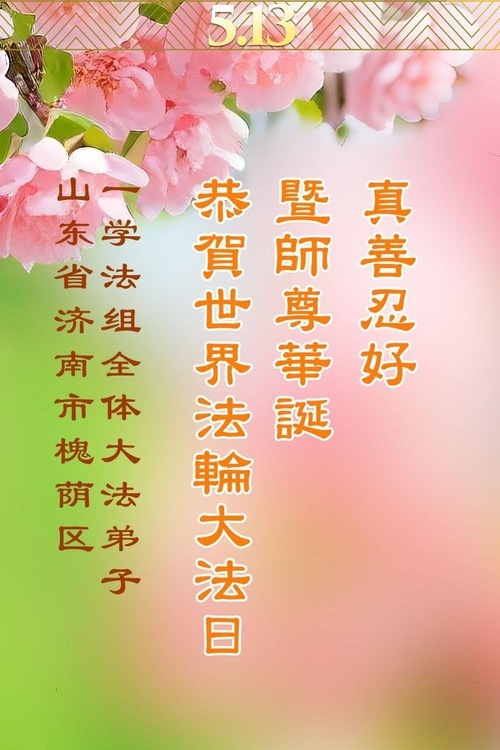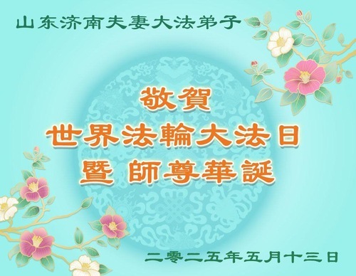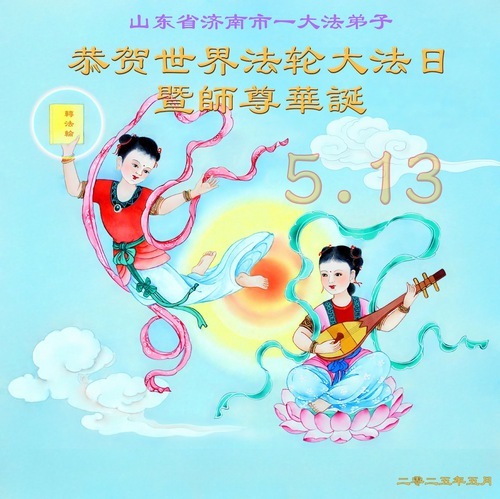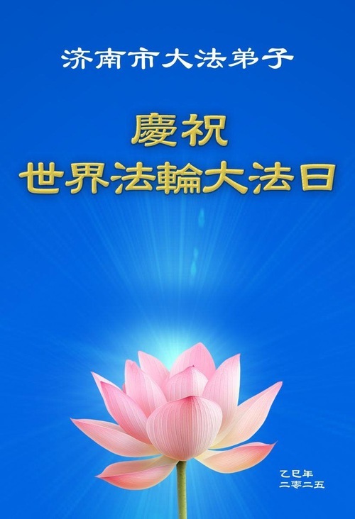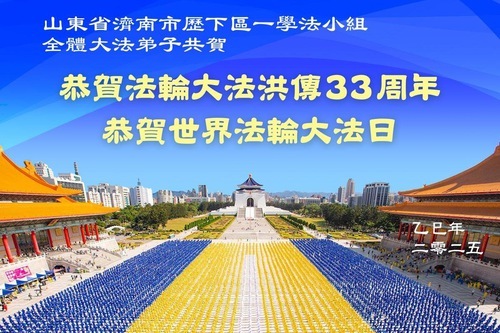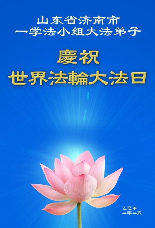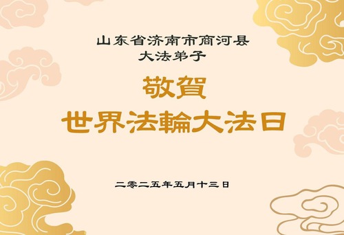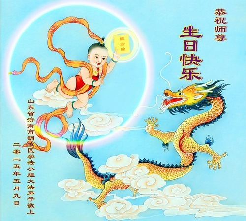 Практикующие Фалунь Дафа из города Цзинань желают уважаемому Учителю счастливого Дня рождения и празднуют Всемирный День Фалунь Дафа!