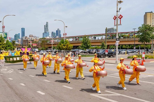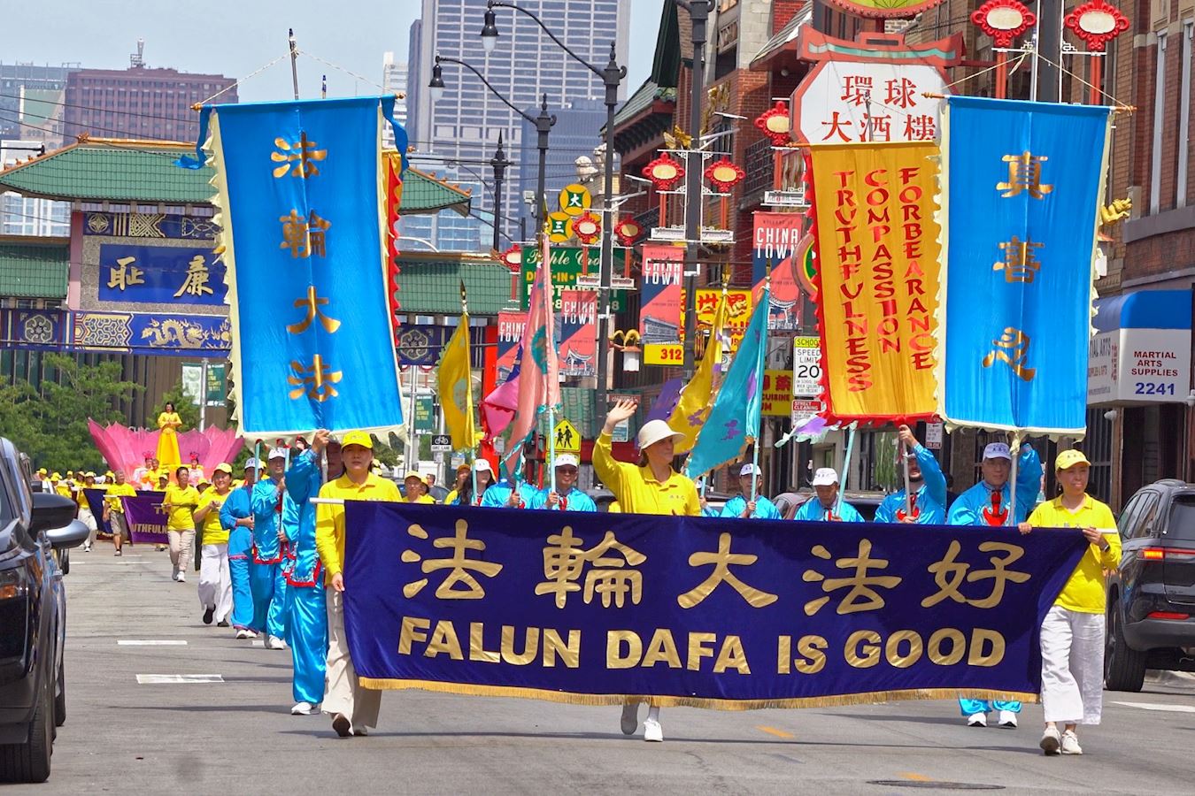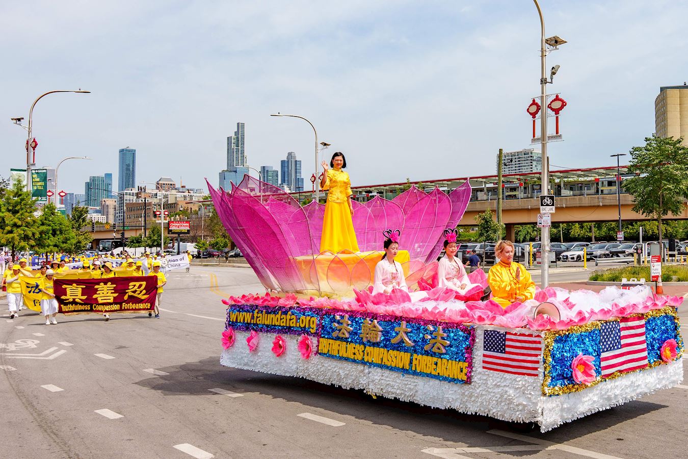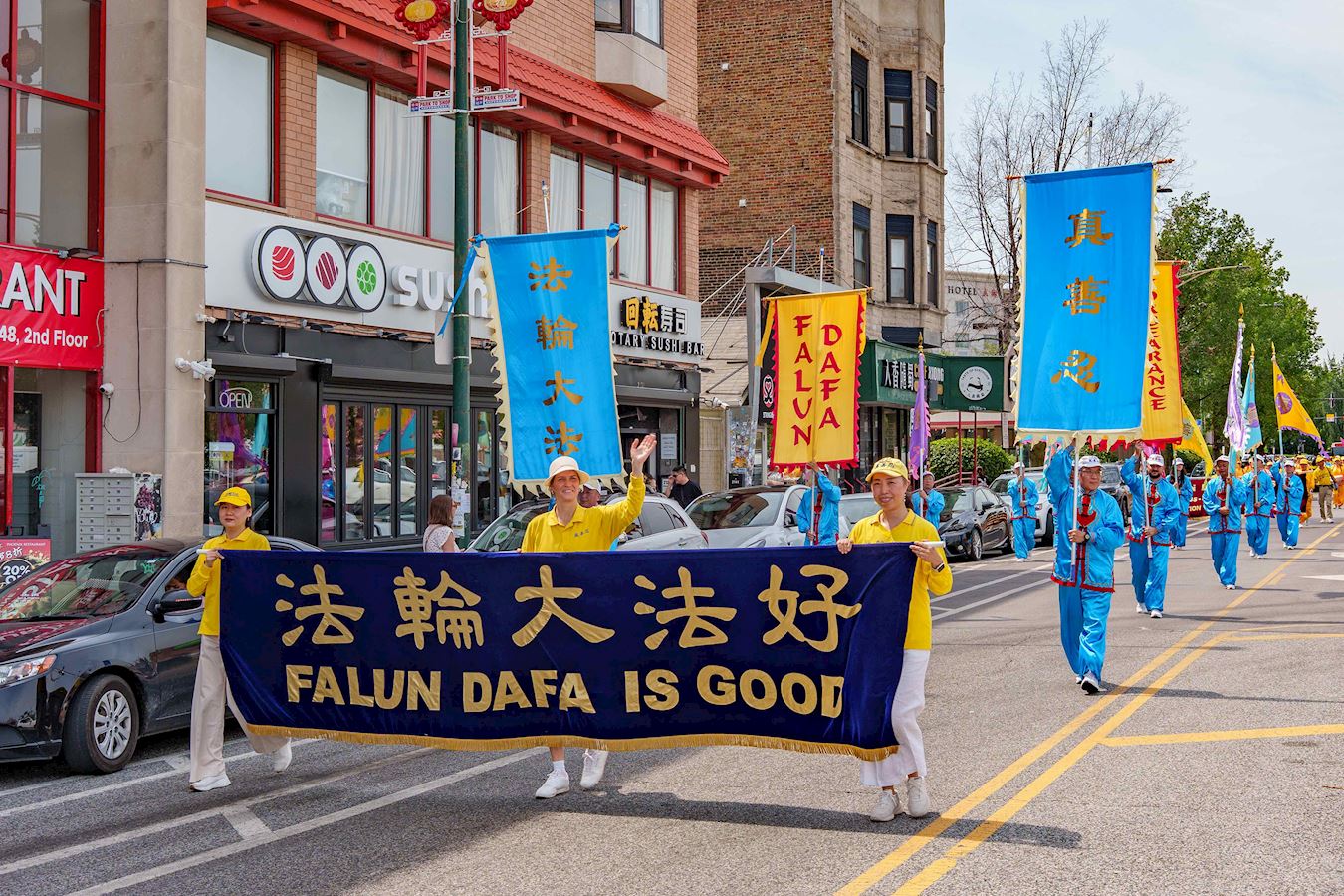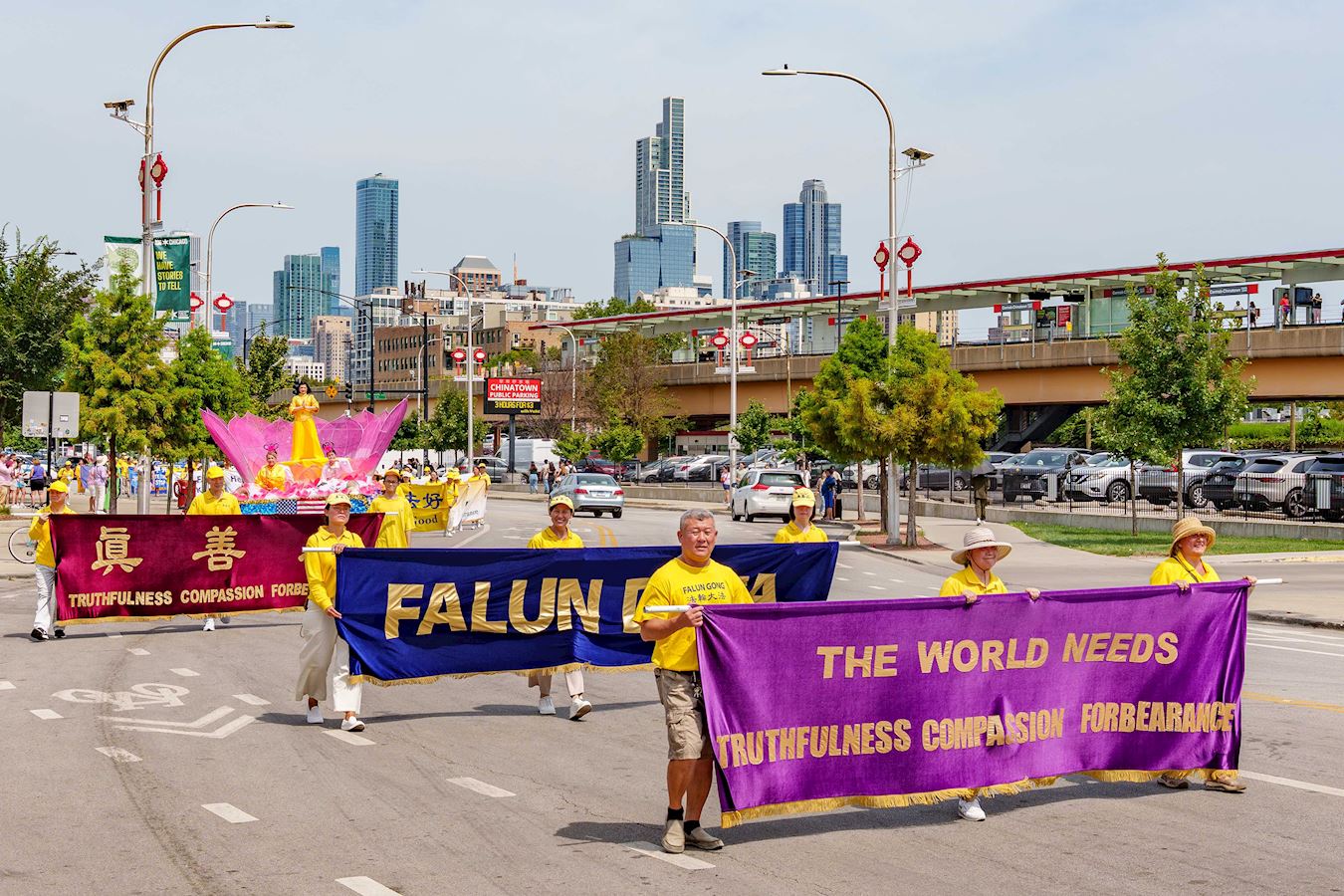 Поскольку мероприятие проходило в разгар туристического сезона, в Чикаго было множество туристов. Шествие стартовало от мемориального парка Сунь Ятсена, одной из главных достопримечательностей китайского квартала. Колонну возглавляли практикующие, которые несли плакаты с надписями «Фалунь Дафа несёт добро» и «Истина, Доброта, Терпение». За ними следовала группа барабанщиков в костюмах династии Тан и движущаяся платформа. Затем шла группа, демонстрировавшая упражнения, и практикующие в белых одеждах с портретами последователей Дафа, погибших в результате преследования в Китае.