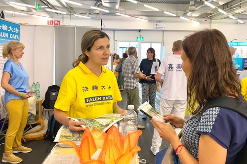 Жительница Германии, которая ездила в Китай изучать традиционную китайскую медицину, рассказала практикующей, что материковый Китай всё сильнее превращается в общество тотальной слежки. Она сказала, что больше не ездит в Китай, потому что там повсюду установлены камеры наблюдения. Пообщавшись с практикующей, она заинтересовалась Фалунь Дафа и сказала, что будет рекомендовать Фалунь Дафа во время своего семинара на выставке.