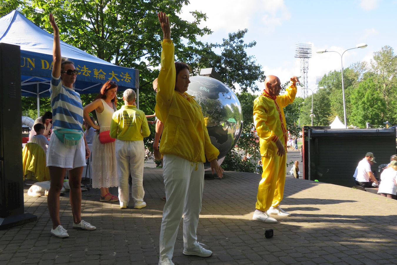 Практикующие Фалунь Дафа демонстрируют упражнения во время молодёжного фестиваля Kopums в Лиепая (Латвия), 16 августа 2025 года