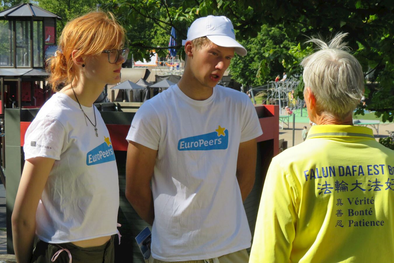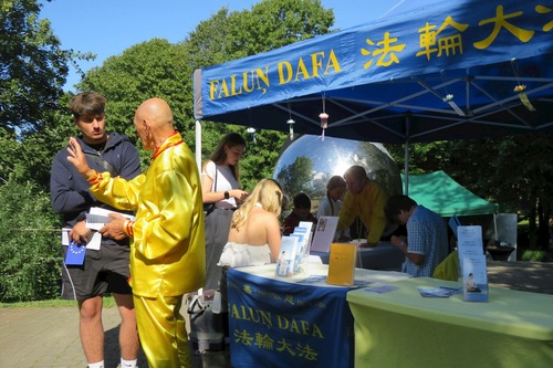 Многие молодые люди пообщались с практикующими, задавая им различные вопросы о Фалунь Дафа. Одни просили показать движения упражнений Фалунь Дафа, другие говорили, что хотели бы совершенствоваться по Фалунь Дафа, и брали контактную информацию местных практикующих.