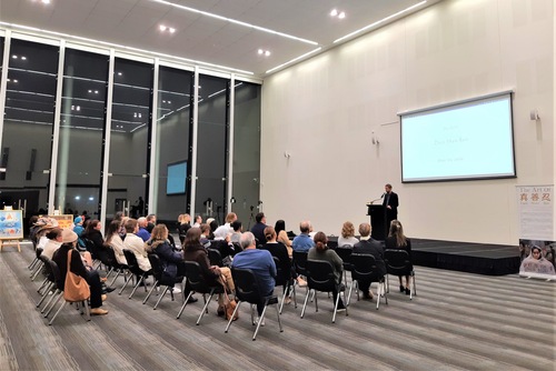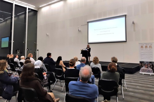 Мишель Вебстер, практикующая Фалуньгун из Перта, на церемонии открытия рассказала о том, как выставка изменила её жизнь.