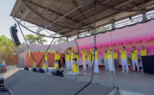 Практикующие также несколько раз продемонстрировали упражнения на сцене. Они знакомили зрителей с практикой, а также рассказывали о пользе упражнений и важности следования принципам «Истина, Доброта, Терпение». Многие, узнав, что обучение Фалунь Дафа проводится бесплатно, с радостью выразили желание попробовать выполнить упражнения.