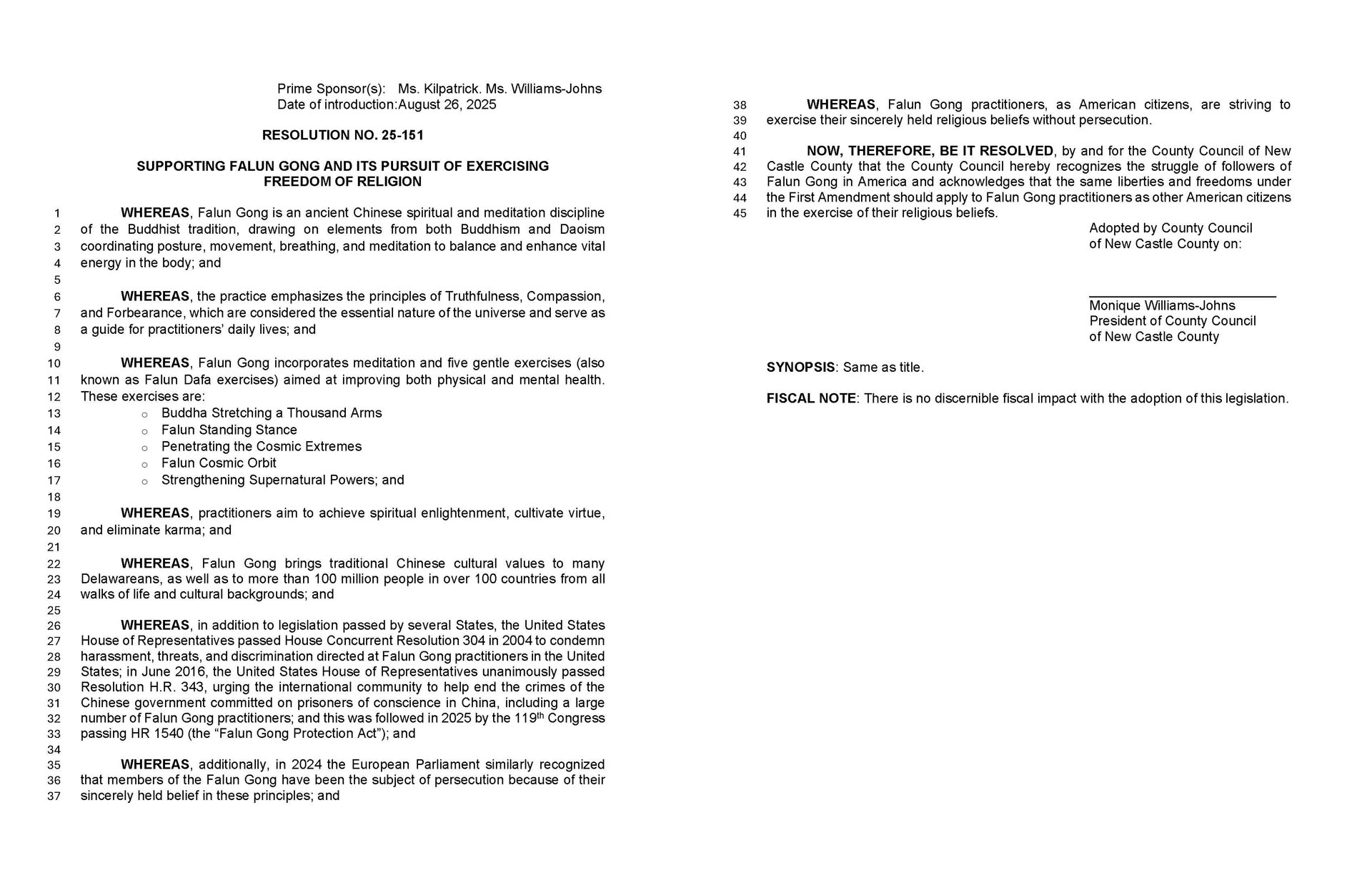 Резолюция под названием «Поддержка [практикующих] Фалуньгун и их стремления к свободе вероисповедания» была инициирована членом Совета округа Нью-Касл Джанет Килпатрик и президентом Совета округа Нью-Касл Моник Уильямс-Джонс. В резолюции Совет округа Нью-Касл заявил, что практикующие Фалуньгун должны находиться под защитой Первой поправки к Конституции США, гарантирующей право на свободу вероисповедания, что и все остальные граждане США.
