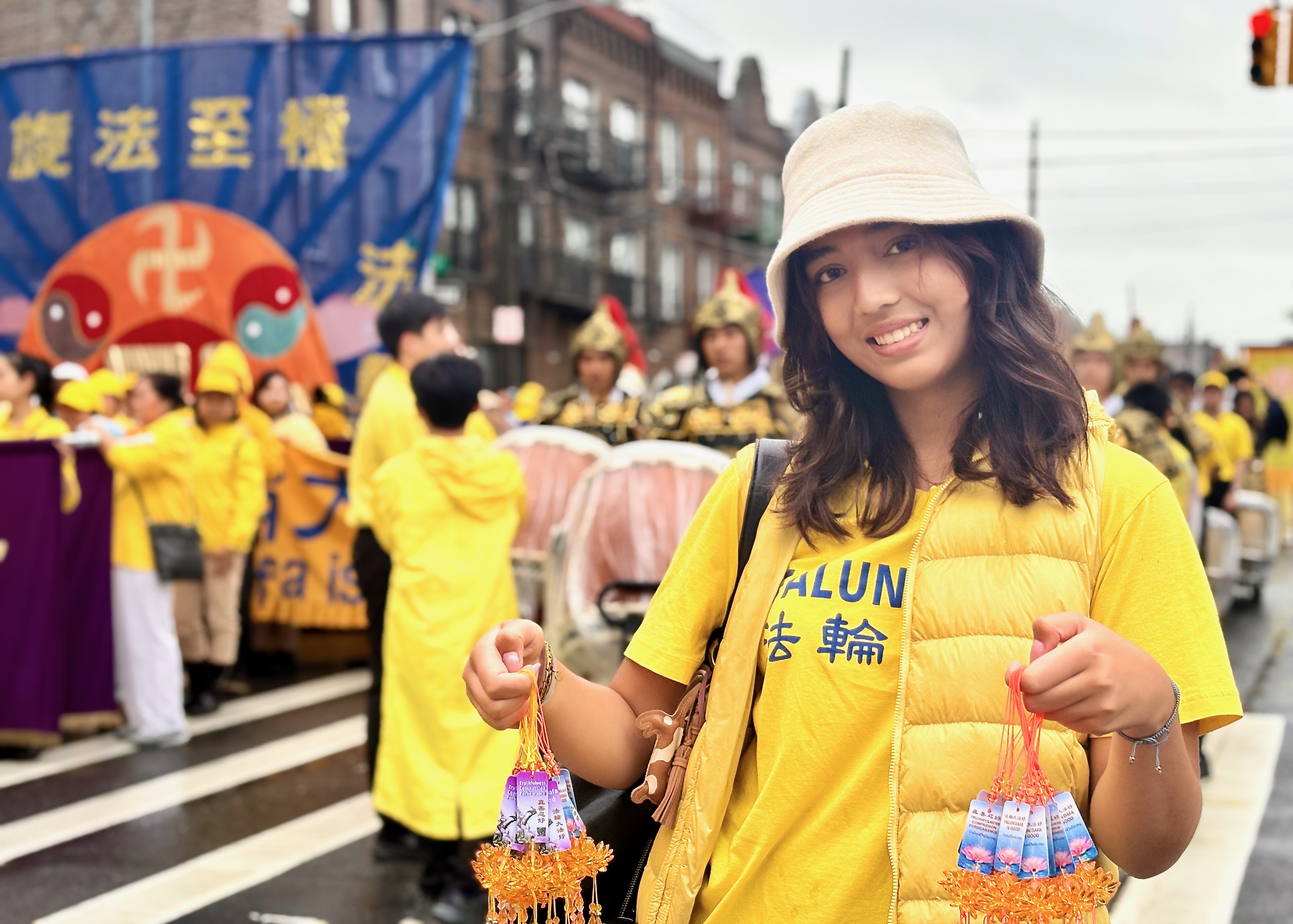 Анжелика Вело – старшеклассница из северного региона штата Нью-Йорк. Она использовала свой выходной день, чтобы приехать в Бруклин и принять участие в параде, а также раздавала материалы прохожим во время шествия, чтобы люди узнали правду о Фалуньгун.
