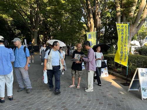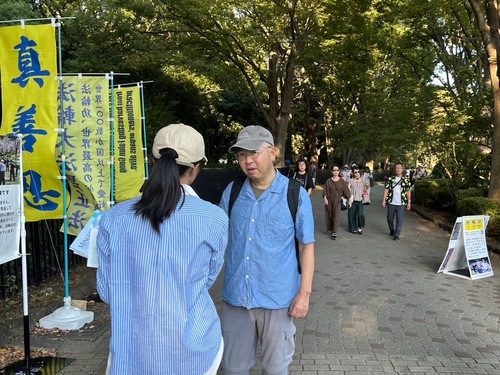 (Minghui.org) Практикующие установили палатку в токийском парке Ёёги во время Китайского фестиваля 6 и 7 сентября 2025 года, чтобы рассказать людям о Фалунь Дафа и разоблачить преследование, осуществляемое компартией Китая (КПК). На больших плакатах было написано: «Истина, Доброта, Терпение – праведные принципы» и «КПК – это не Китай».