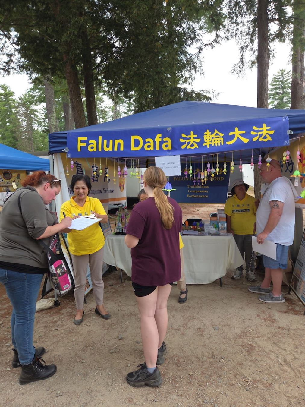 Практикующие знакомят людей с Фалунь Дафа на ярмарке в Хопкинтоне (штат Нью-Гэмпшир, США)