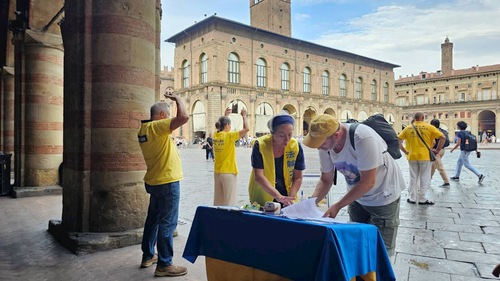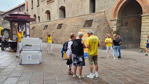 27 августа практикующие провели мероприятие в Болонье. Здесь находится старейший непрерывно действующий университет – Болонский университет, основанный в 1088 году. Несмотря на дождь, практикующие установили стол с материалами и информационные стенды на площади Джорджо Гуаццалоки, расположенной недалеко от известной площади Маджоре. Они демонстрировали упражнения и рассказывали людям о пользе Фалунь Дафа.