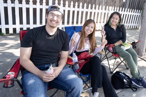 Джефф и его друзья Мари (в центре) и Бритни сказали, что были рады видеть практикующих Фалуньгун на параде
