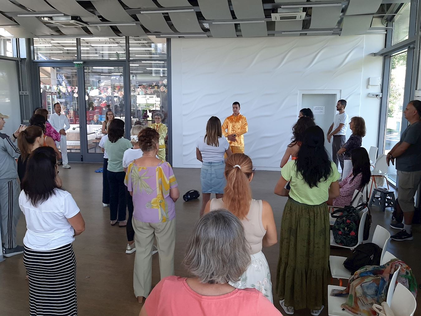 Весь зал был заполнен людьми, которые повторяли за практикующими движения упражнений. Многие проявили интерес к практике; некоторым понравилась медитация, и они говорили, что чувствовали себя расслабленными, но при этом наполненными энергией.