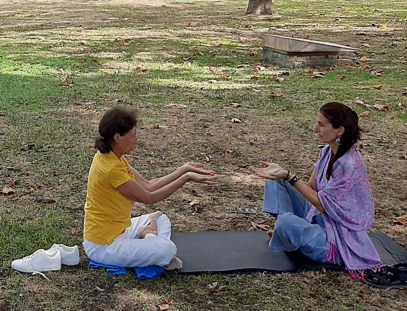 Практикующая обучает женщину упражнениям Фалунь Дафа