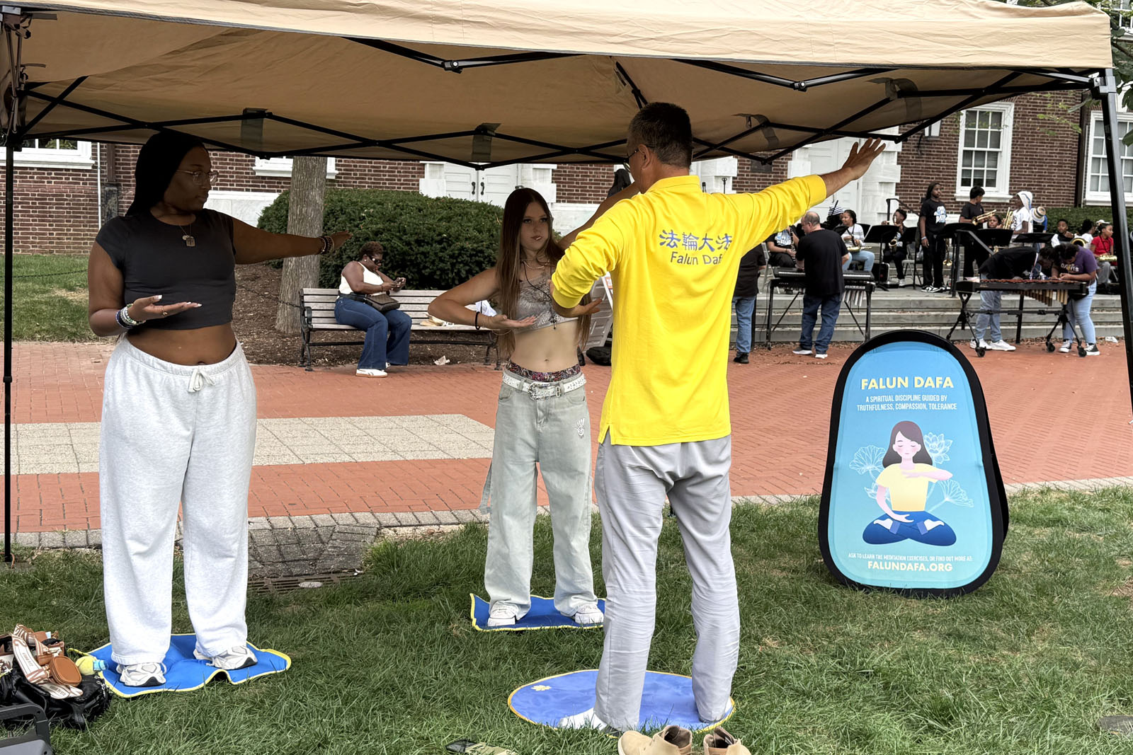 Палатка практикующих Фалунь Дафа выделялись среди множества других участников. Многие люди останавливались, чтобы ознакомиться с практикой и выполнить упражнения. Джон, социальный работник на пенсии, который остановился, чтобы понаблюдать за демонстрацией упражнений, сказал: «Движения очень плавные. Мне особенно понравилась медитация; в ней чувствуется настоящий покой и умиротворение».
