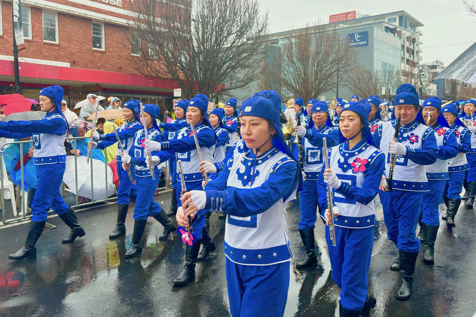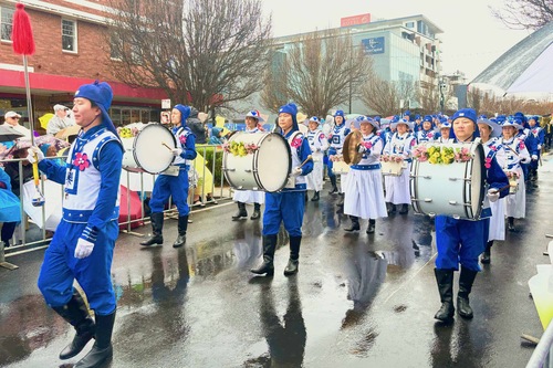 Колонну Фалунь Дафа возглавил марширующий духовой оркестр Тянь Го, за которым следовала команда барабанщиков. На протяжении всего маршрута зрители встречали их восторженными аплодисментами и радостными возгласами.