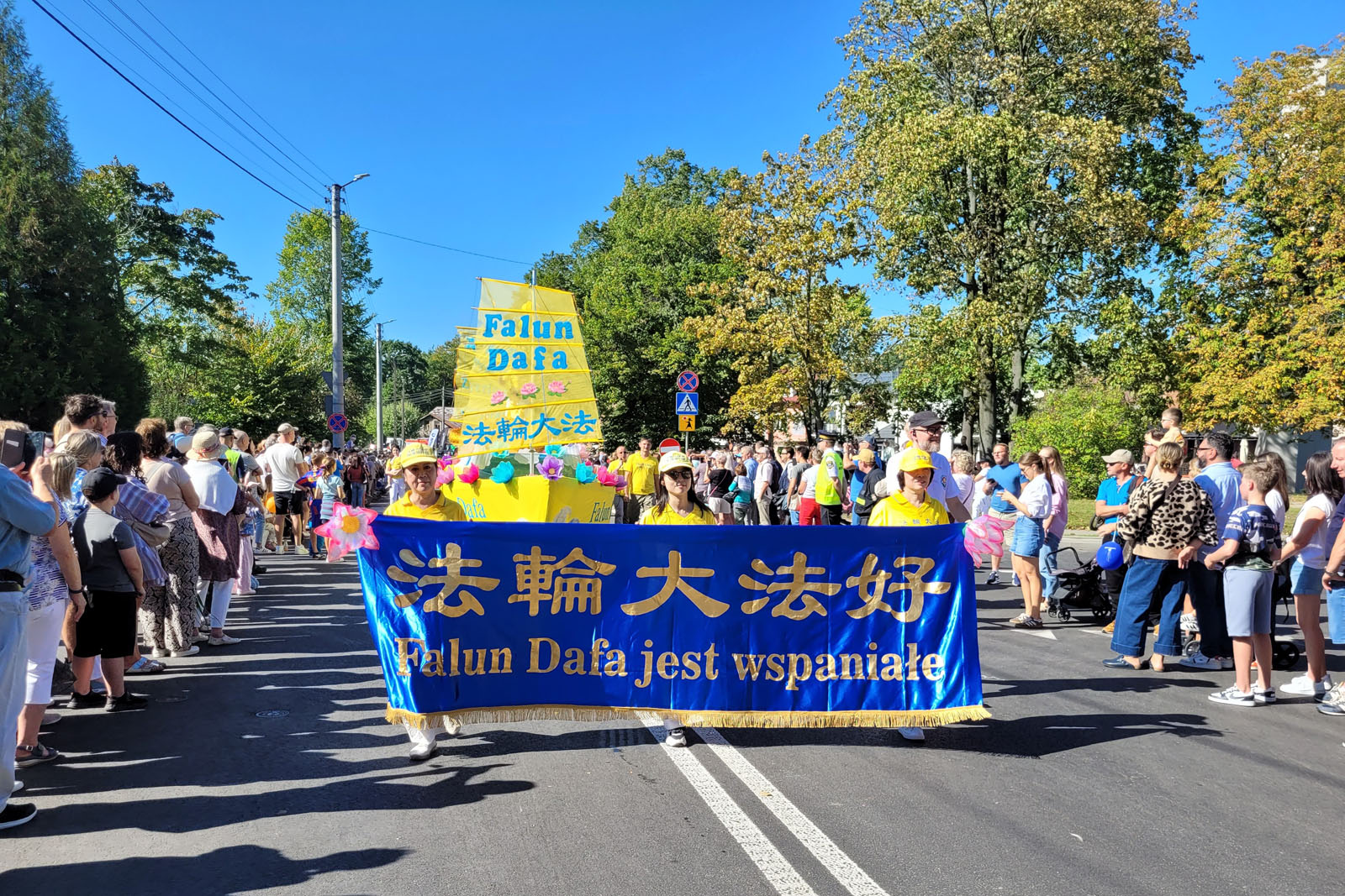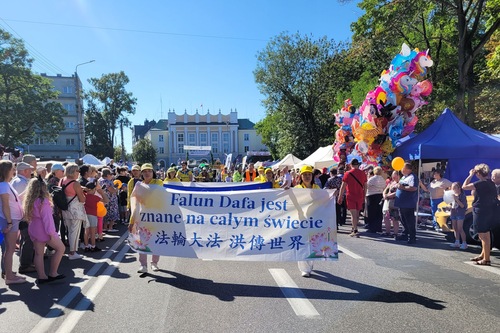 Практикующие Фалунь Дафа из Польши участвуют в парадах, проходящих в рамках фестиваля урожая, уже много лет. В этом году их яркая платформа, красиво украшенная цветами, и традиционные китайские золотые драконы вновь стали популярной частью парада и были встречены аплодисментами. Мать и сын на платформе под музыку демонстрировали упражнения Фалунь Дафа. Практикующий шёл рядом с платформой и через громкоговоритель знакомил публику с упражнениями. Идущие по обе стороны от платформы практикующие раздавали зрителям буклеты. На плакатах на китайском и польском языках были написаны следующие слова: «Фалунь Дафа несёт добро», «Истина, Доброта и Терпение делают нас хорошими людьми», «Фалунь Дафа практикуют во всём мире» и «Фалунь Дафа в Польше». Исполнители танца Золотого дракона общались с публикой, вызывая удивление и восторг.