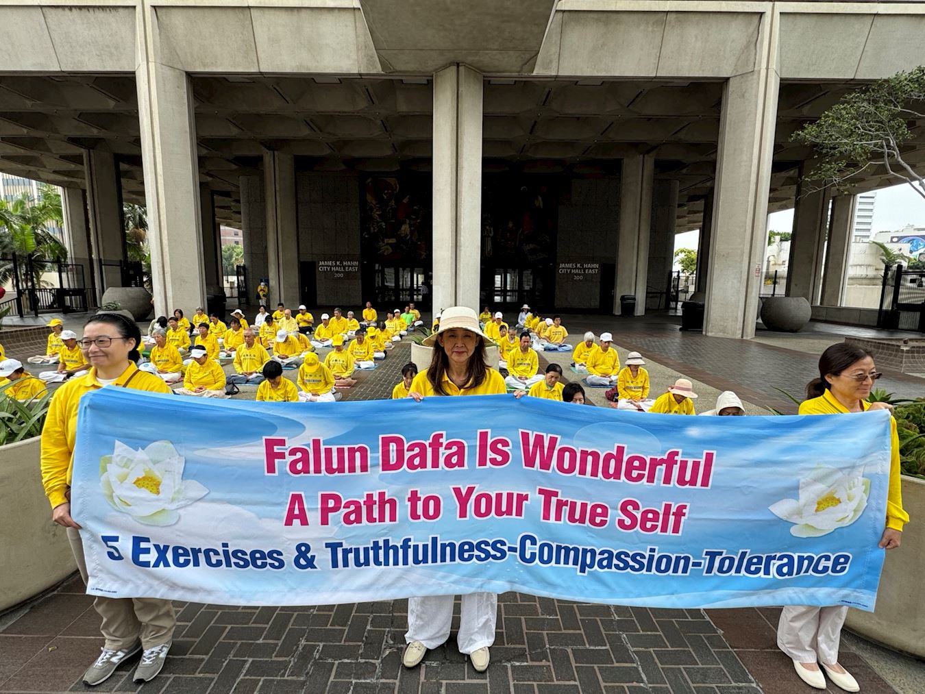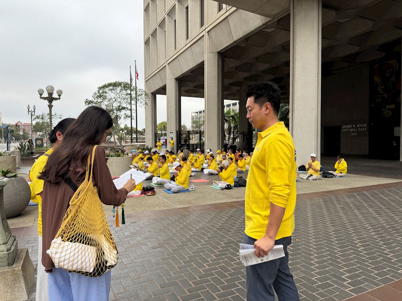 Рядом с большим плакатом со словами «Пожалуйста, помогите остановить транснациональное преследование Фалуньгун компартией Китая» практикующие спокойно медитировали и выполняли упражнения, и эта умиротворяющая сцена контрастировала с шумом на городских улицах. Государственные служащие и другие прохожие останавливались, чтобы посмотреть и узнать больше об этой проблеме.