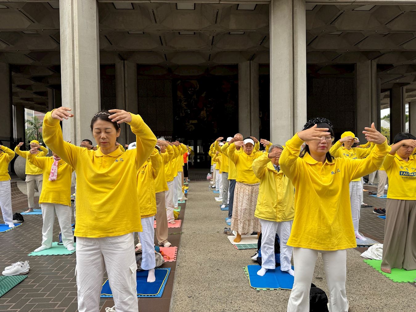 Практикующие Фалуньгун перед зданием мэрии Лос-Анджелеса выполняют упражнения и рассказывают прохожим о транснациональных репрессиях против Фалуньгун, осуществляемых компартией Китая, 26 августа 2025 года
