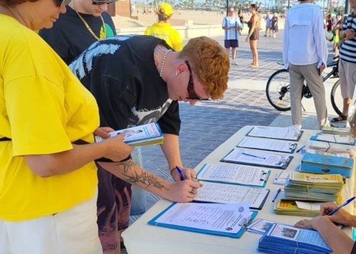Местные жители Хосе Мануэль и его жена Патрисия остановились у стенда практикующих Фалунь Дафа, чтобы пообщаться с ними. Хосе был потрясён и встревожен, узнав о насильственном извлечении органов у живых последователей Фалуньгун с санкции компартии Китая, и подписал петицию.