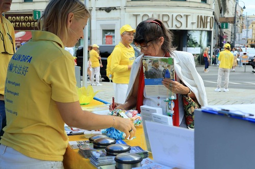 Двое практикующих сыграли и спели песню, написанную практикующими Фалунь Дафа. Молодая немецкая девушка Виола Хакер сказала, что её привлекли слова песни. Она закончила музыкальный факультет в Вене и планирует выступать в опере. О словах песни она сказала: «В ней говорится, что жизнь – это не только стремление к богатству, и я считаю, что это очень важное послание. Жизнь – это ещё и человеческая природа и отношения с другими людьми, а не только деньги и власть».