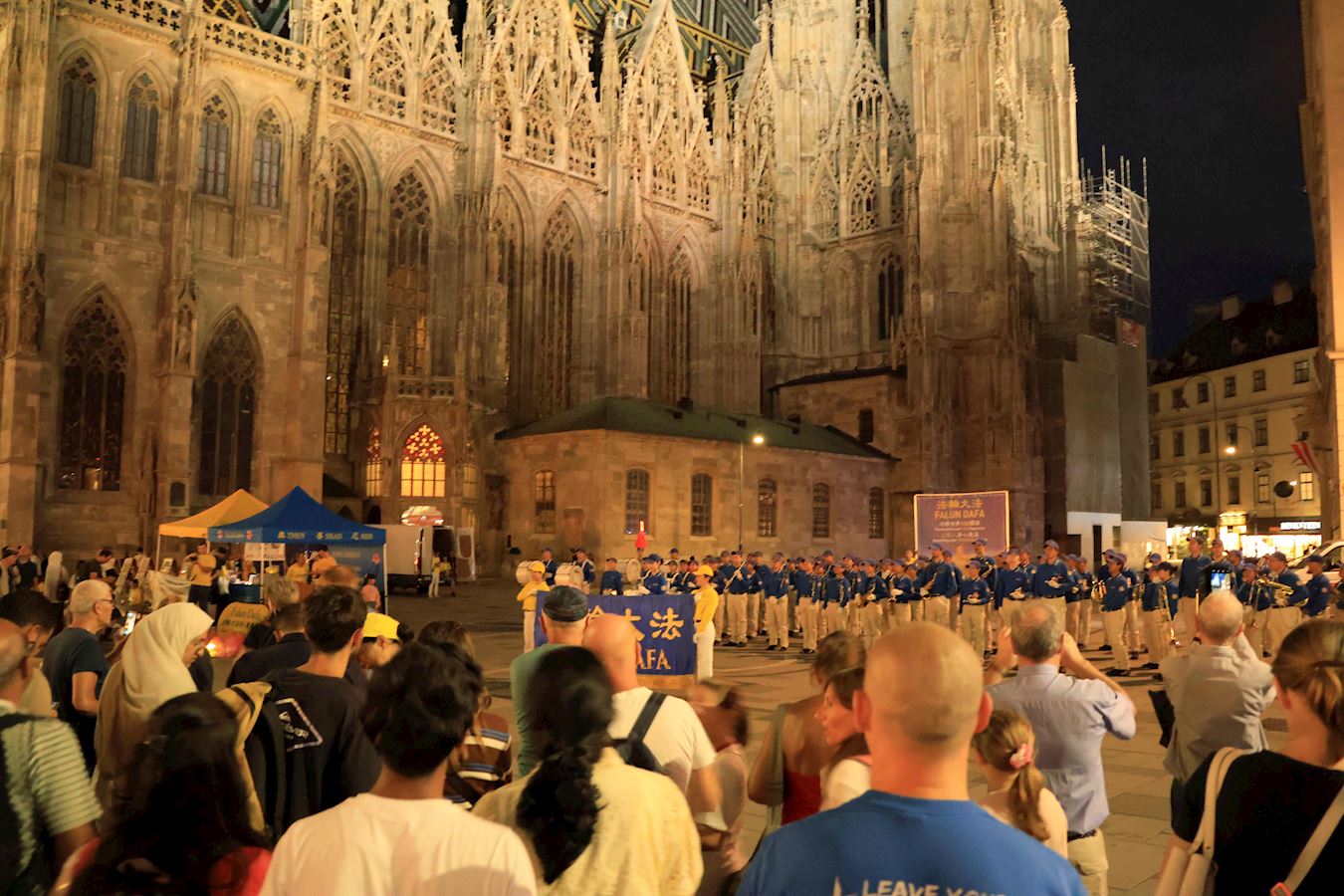 (Minghui.org) Марширующий духовой оркестр Тянь Го, состоящий из практикующих Фалунь Дафа, выступил 29 августа 2025 года на площади Стефансплац в Вене (Австрия), а на следующий день – на площади Гельмут-Цильк-Плац. Многие люди говорили, что им понравилась музыка, а некоторые отметили, что никогда раньше не слышали ничего подобного. «Очень хорошая музыка, я слушал её всего несколько минут и почувствовал, что моя душа перенеслась в другое место. Я также видел, как кто-то медитировал, что не часто увидишь в Вене. Я хочу узнать больше о Фалунь Дафа», – сказал один из зрителей. Другой человек сказал: «Музыка потрясающая, как и их дисциплина и униформа, которые привлекли наше внимание».