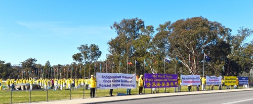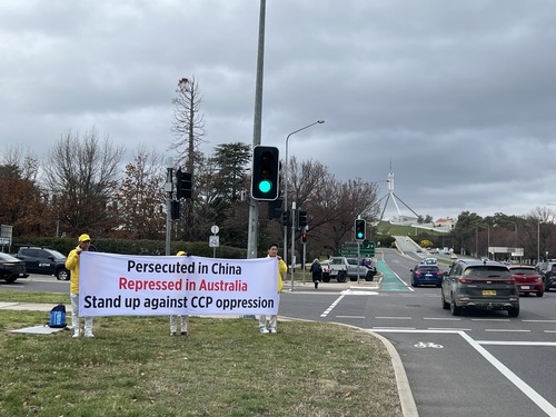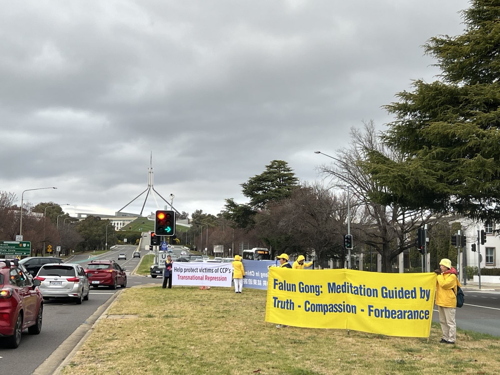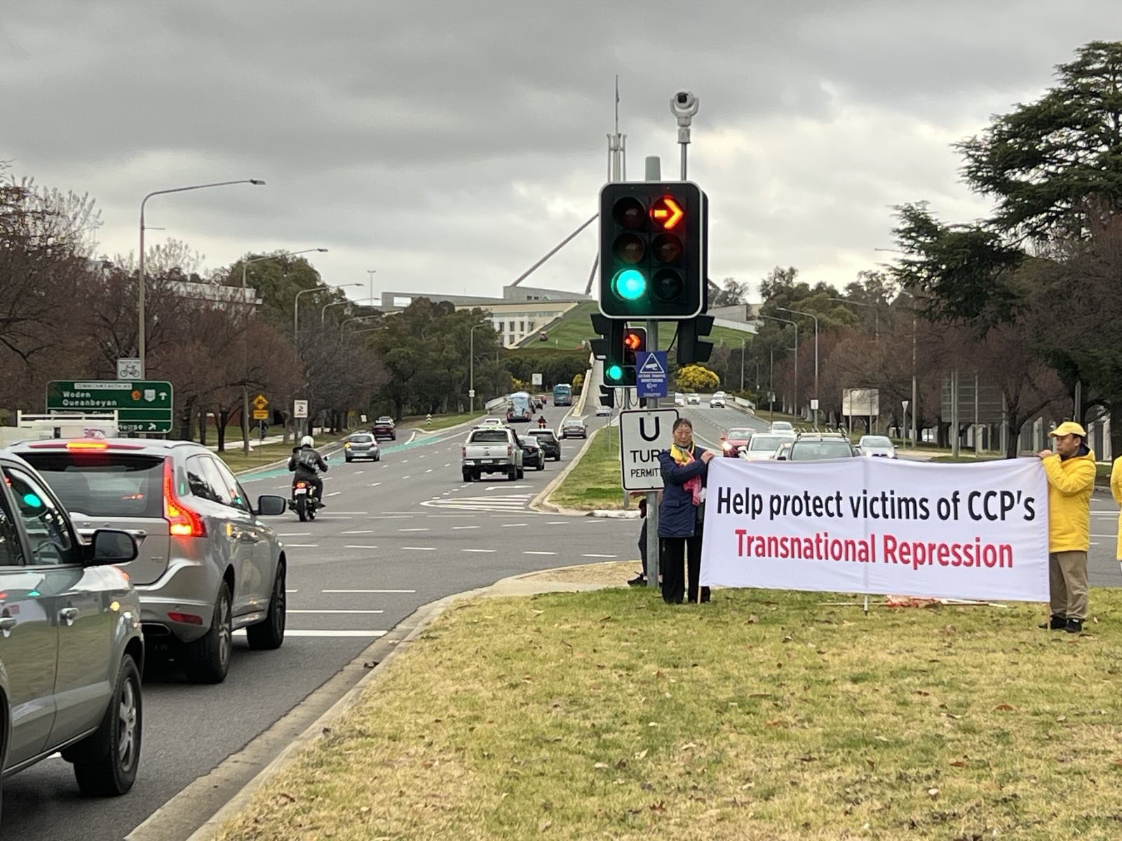 2 сентября практикующие разместили плакаты вдоль главных дорог в Канберре, чтобы сообщить людям о транснациональных репрессиях, осуществляемых компартией Китая. На двух плакатах было написано: «Преследуемые в Китае, репрессируемые в Австралии, встаньте против угнетения КПК» и «Помогите защитить жертв транснациональных репрессий, осуществляемых компартией Китая».