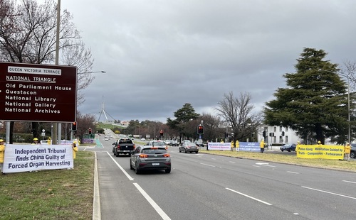 2 сентября практикующие разместили плакаты вдоль главных дорог в Канберре, чтобы рассказать людям о транснациональных репрессиях, осуществляемых компартией Китая