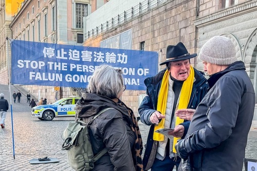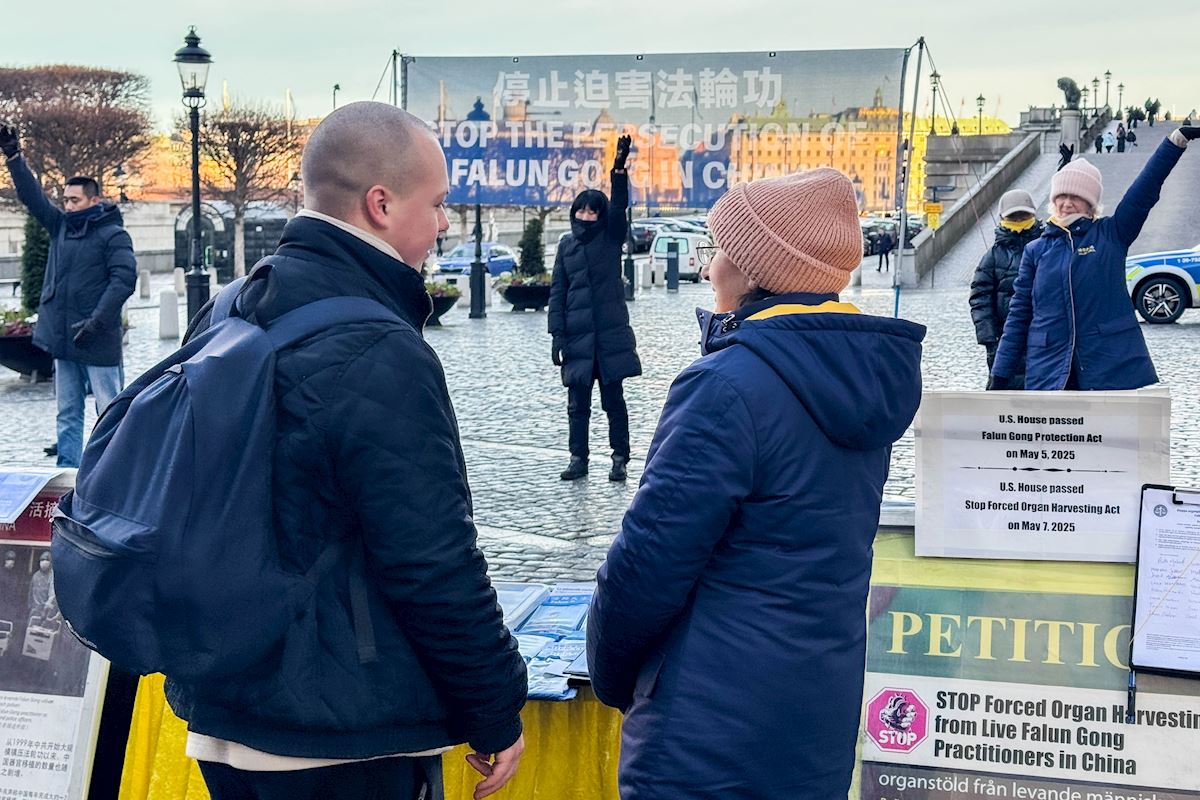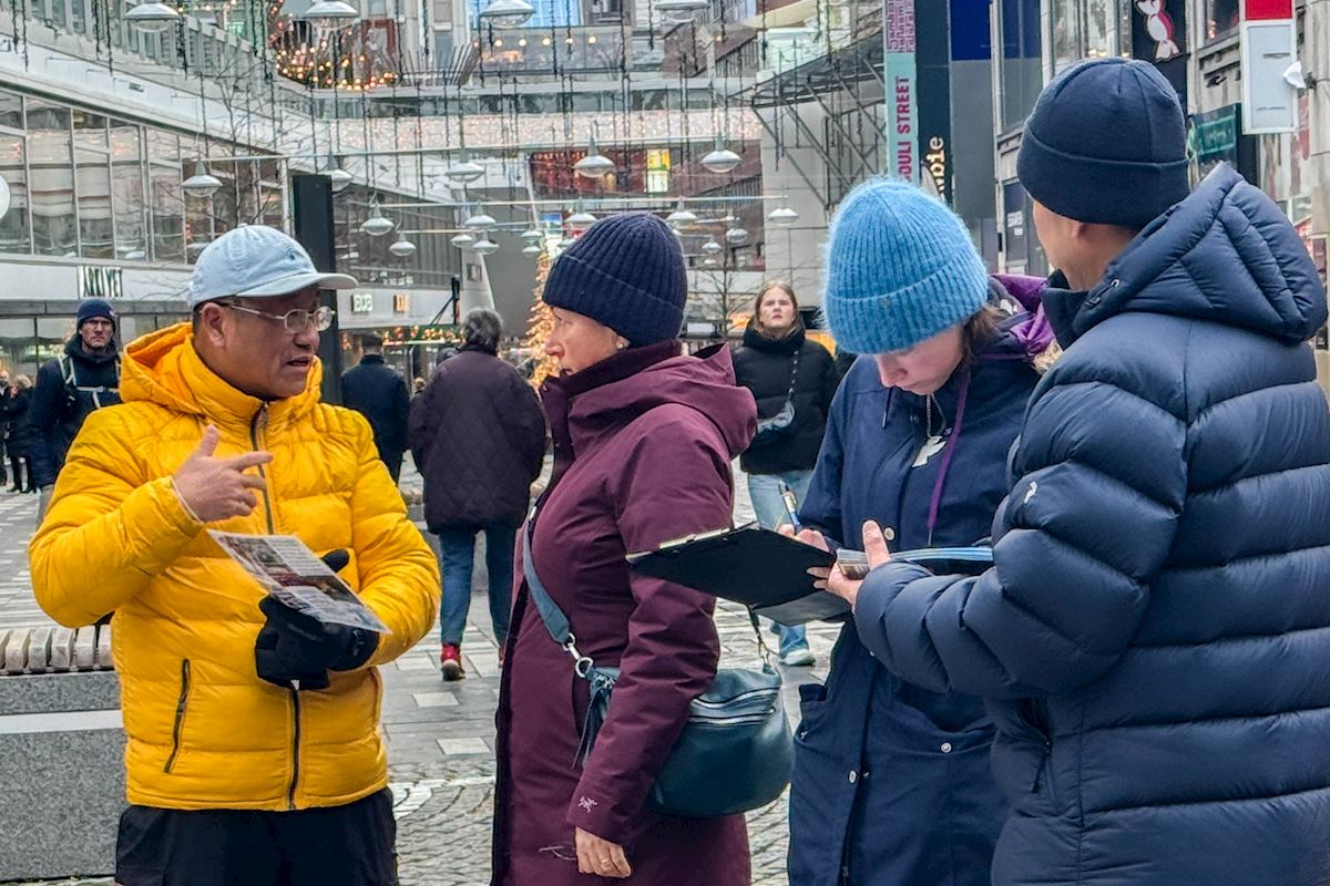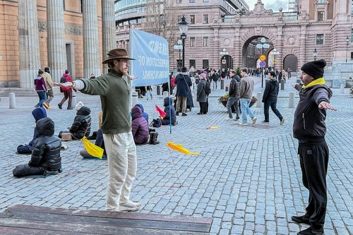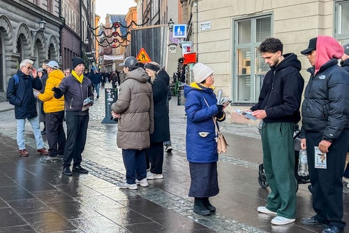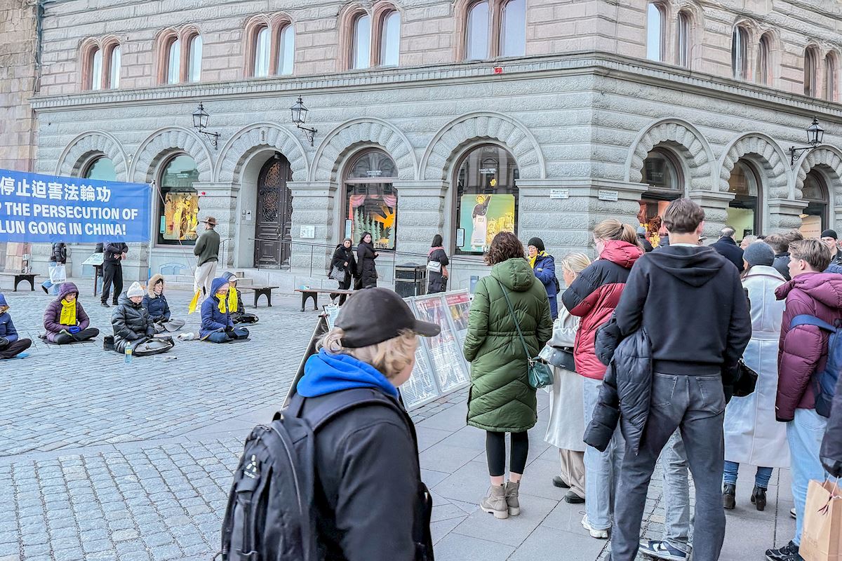 В декабре 2025 года каждую пятницу и субботу днём практикующие Фалунь Дафа (Фалуньгун) проводили мероприятия на Монетной площади рядом с Королевским дворцом и возле знаменитого Стокгольмского концертного зала. Они выполняли упражнения и собирали подписи под петицией с призывом прекратить преследование практикующих Фалунь Дафа в Китае.