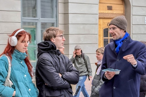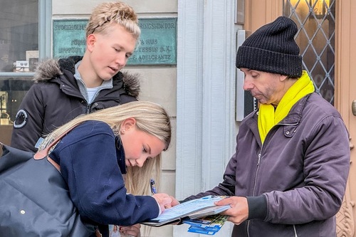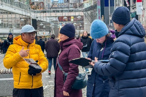 Рядом со знаменитым Стокгольмским концертным залом практикующие рассказывают о преследовании Фалунь Дафа в Китае многим людям, которые после этого подписывают петицию