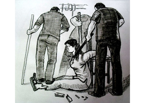 Охранники и заключённые сбивают практикующих с ног и, придавив к полу, бьют их ногами по голове, или прижав голову практикующей к столу, бьют по ней кулаками.
