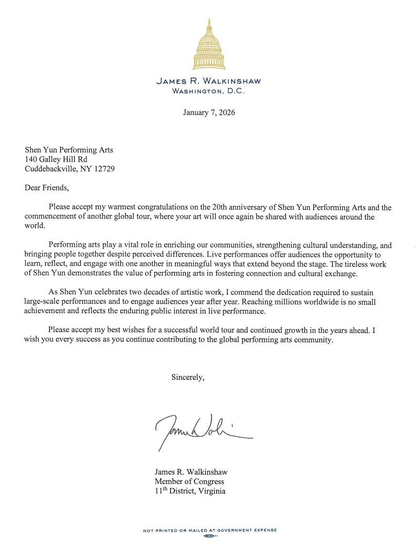 (Minghui.org) Конгрессмен США Джеймс Уолкиншоу, член Палаты представителей штата Вирджиния, направил поздравительное письмо коллективу компании Shen Yun Performing Arts в честь 20-й годовщины со дня основания труппы.