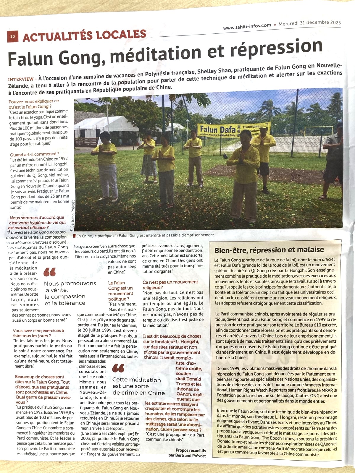 Репортёры крупнейшей местной газеты Tahiti Infos взяли у них интервью и опубликовали статью на целую страницу под названием «Фалуньгун, медитация и преследование».