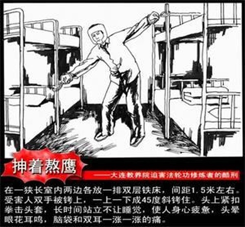 Охранники исправительно-трудового лагеря длительное время лишали женщину сна, приковав её руки к нижней и верхней перекладине двух противоположных кроватей под углом 45 градусов (см. изображение ниже). Она вообще не могла выпрямиться. Охранники также надели ей на голову шлем. Один из них, Дин Хайин, ударил её кулаком с такой силой, что у неё пошла кровь из носа. После длительного стояния и недосыпания у неё кружилась голова, а в ушах звенело. В голове и ушах также ощущалась пульсирующая боль.