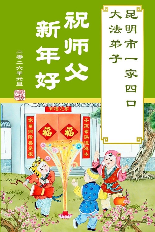 Семья из четырёх практикующих вместе с новым практикующим из города Куньмина поздравляет милосердного Учителя с Новым годом!