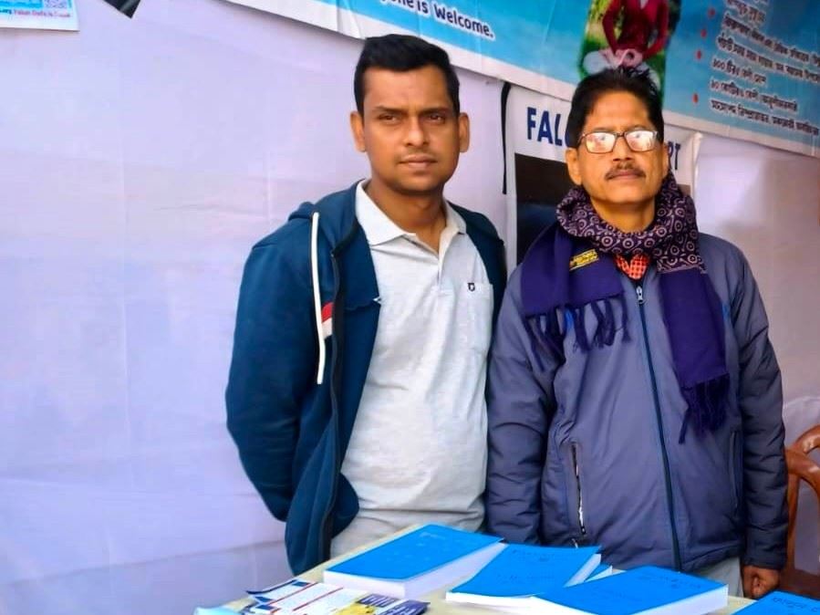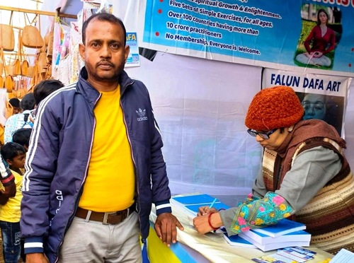 Бимала Санкар Дас (справа) купил Книги «Фалуньгун» и «Чжуань Фалунь» и сказал, что хочет узнать больше о Фалунь Дафа